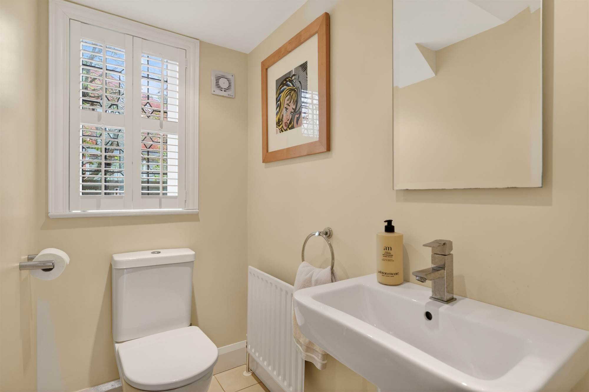 Low flush wc, pedestal wash hand basin, ceramic tiled floor, extractor fan, low voltage spotlights.