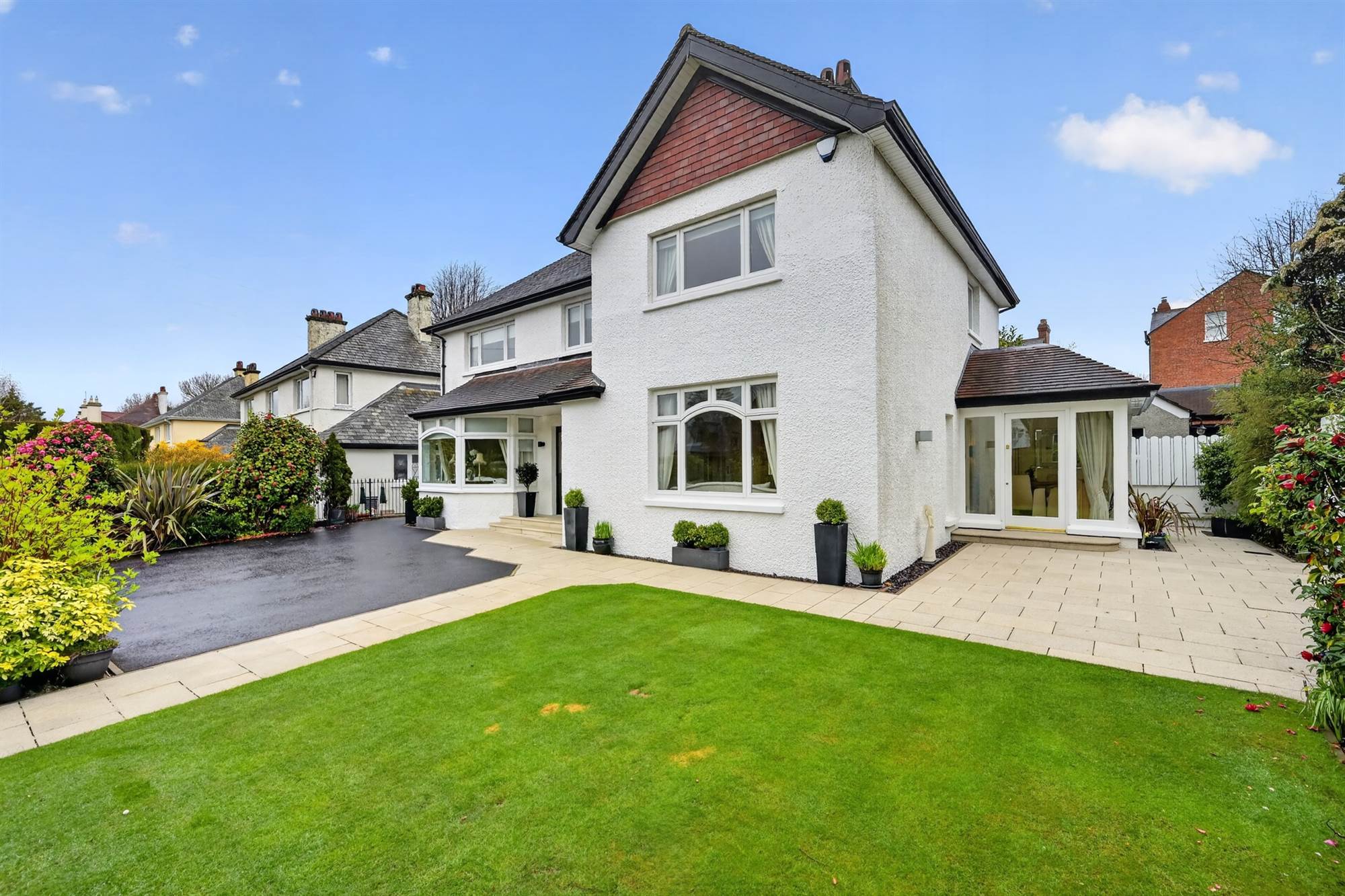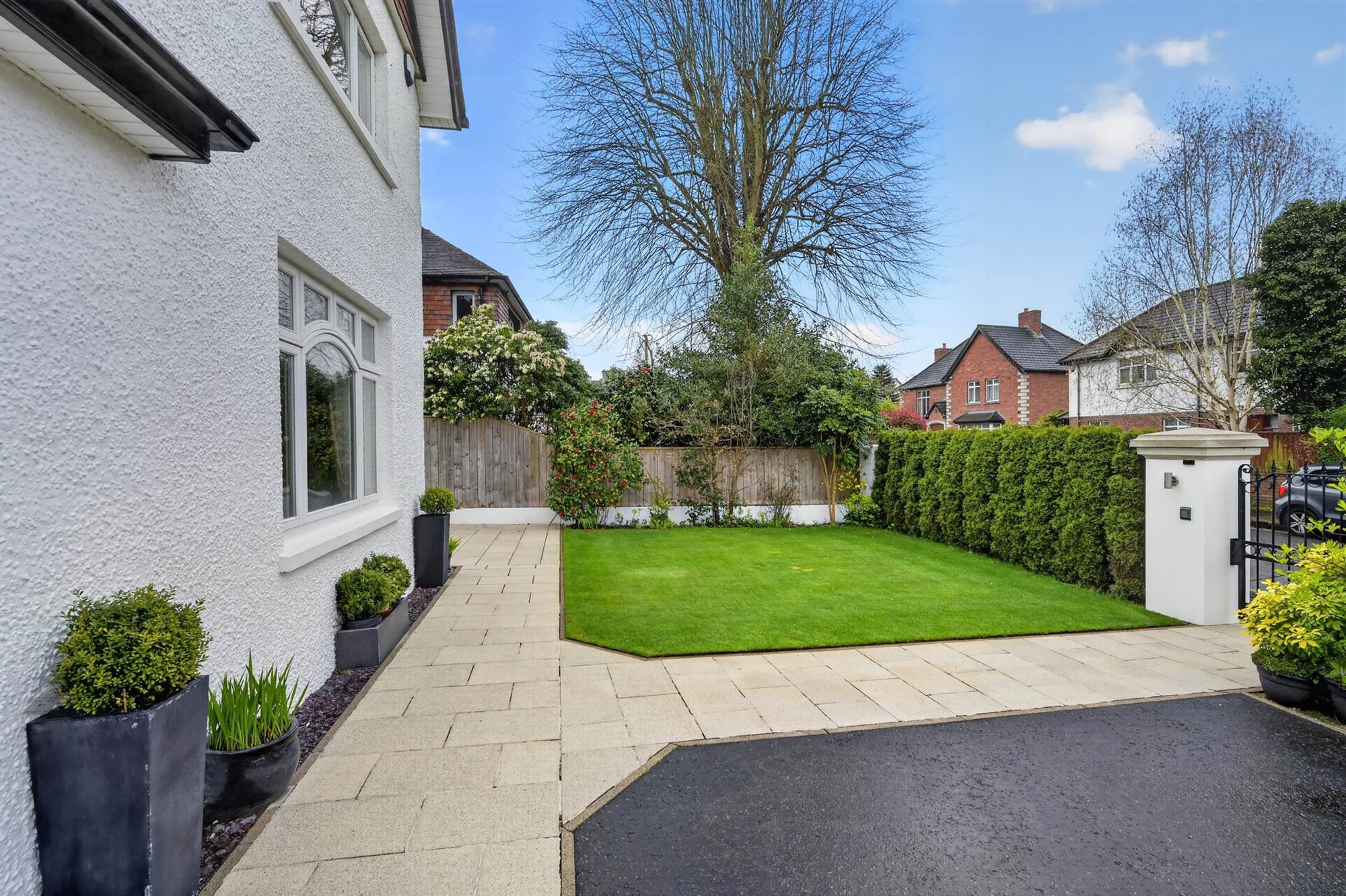 Large Stoned Paved Terrace to the Side, South Facing Front Lawns with Landscaped Beds in Shrubs, Trees and Bushes