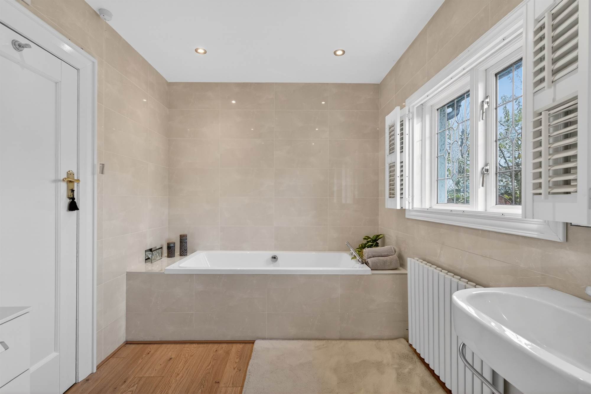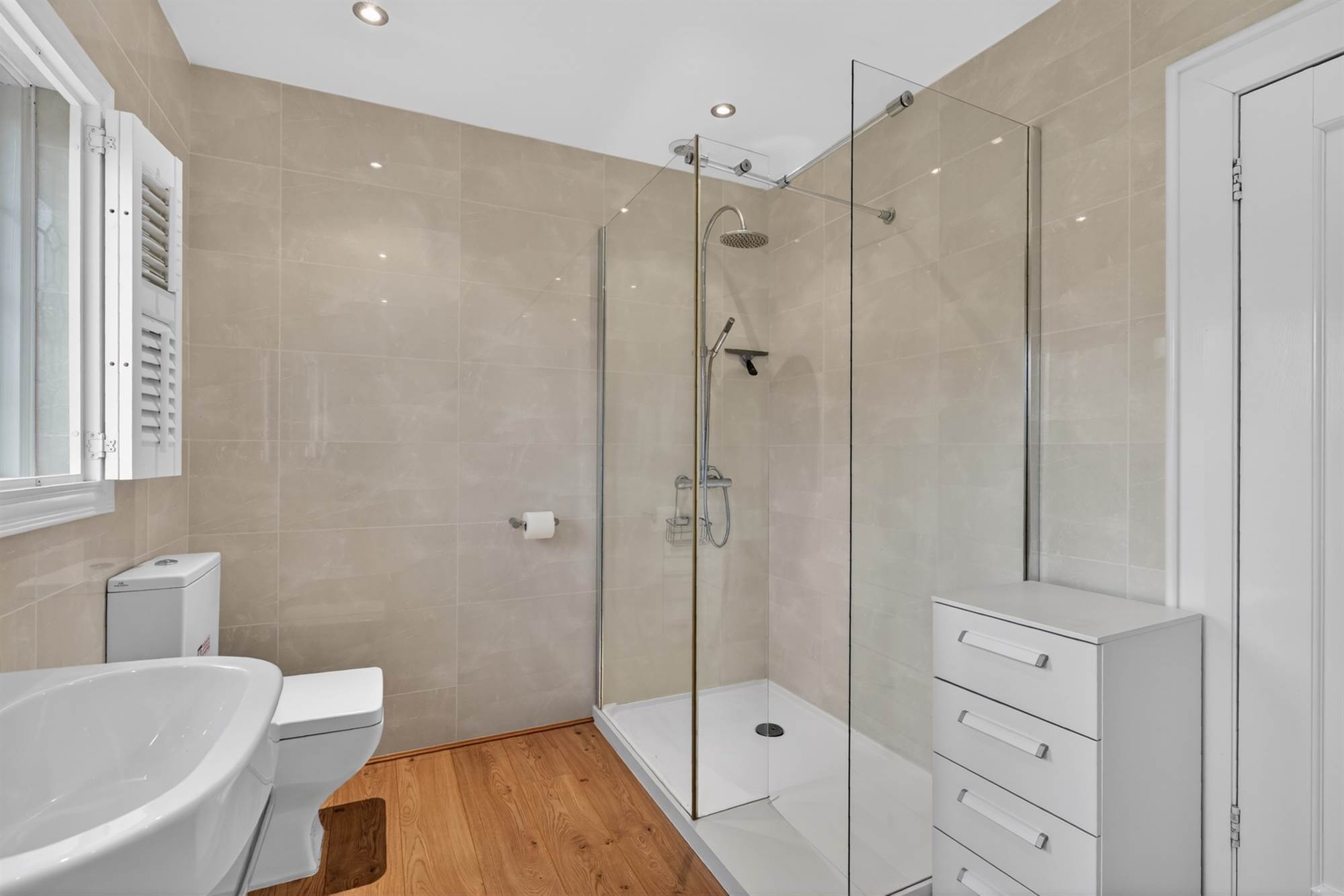 (at widest points). White suite comprising low flush wc, fully tiled shower cubicle, panelled bath with inset tiling, wash hand basin, fully tiled walls, wooden floor, low voltage spotlights, window shutters.