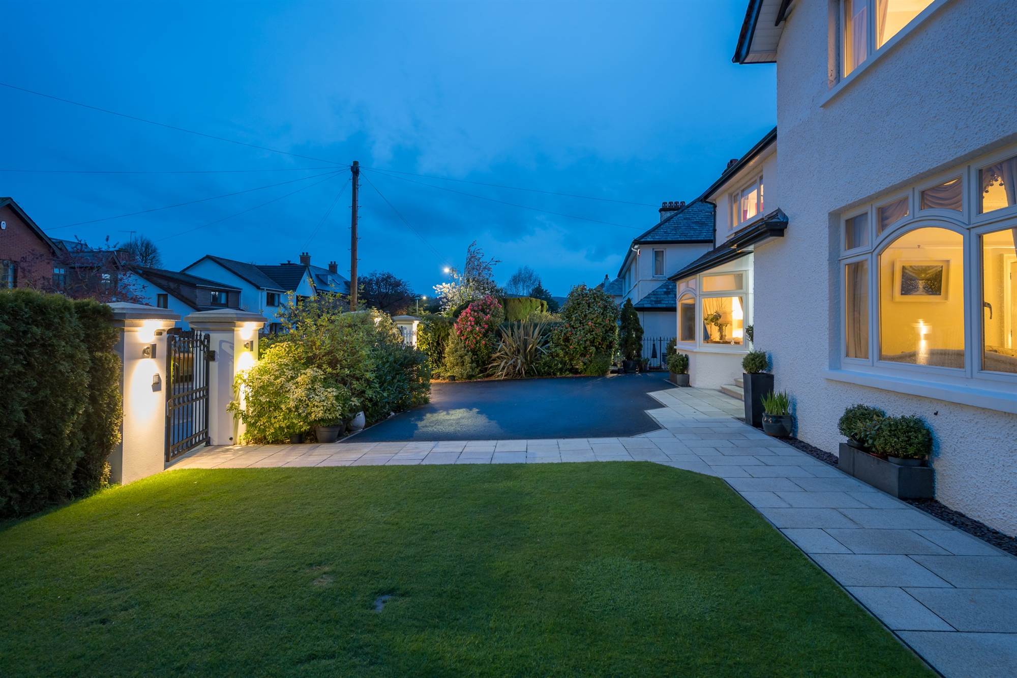 Landscaped, south facing front gardens in lawns, hedging and mature beds with bushes and trees. Electric entrance gates to tarmac car parking for 2-3 cars. Delightful, extensive paved patio area with outside lighting and beds in bushes and trees.