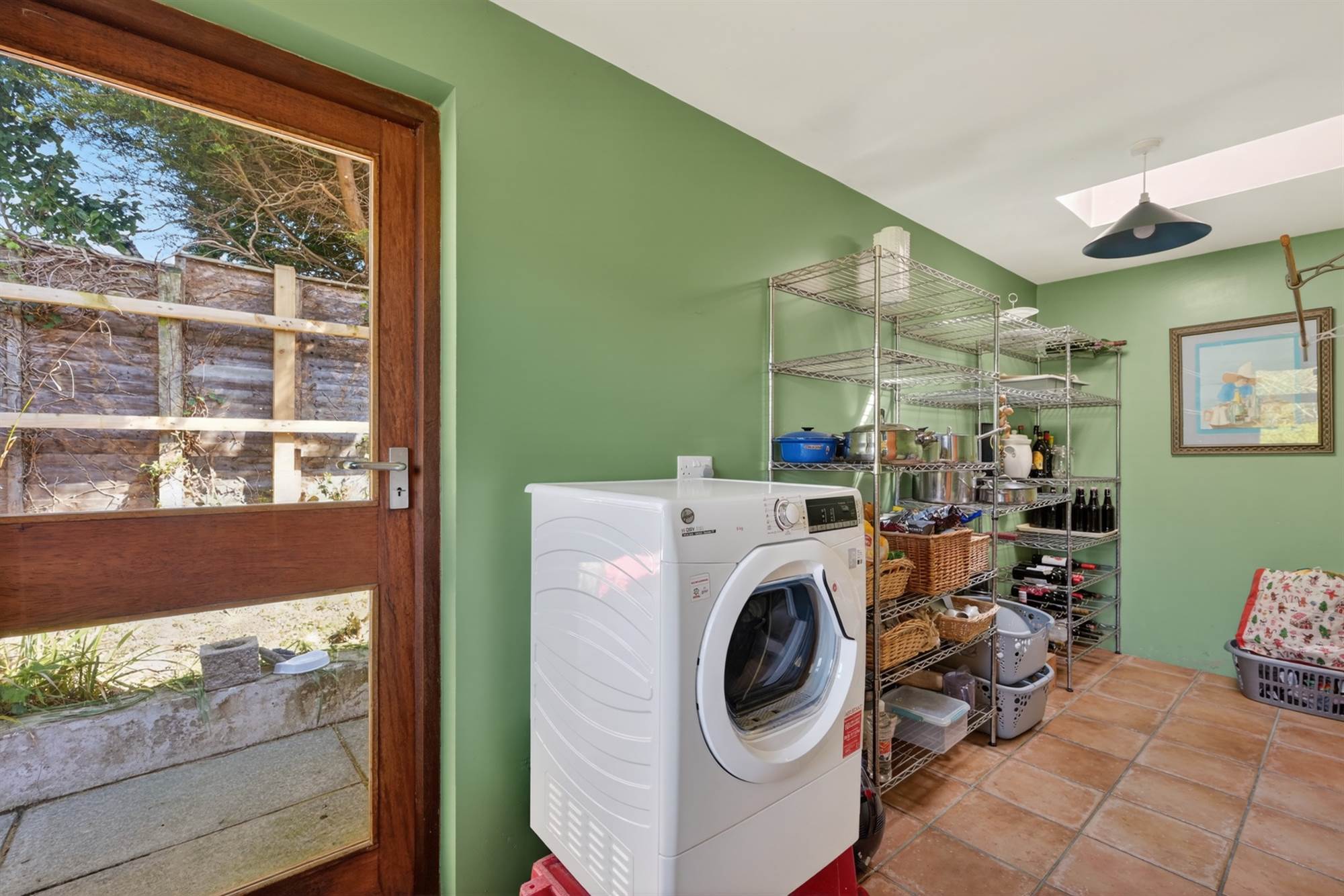 Plumbed for washing machine, ceramic tiled floor, stainless steel double drainer sink unit with mixer tap, double glazed door to side.