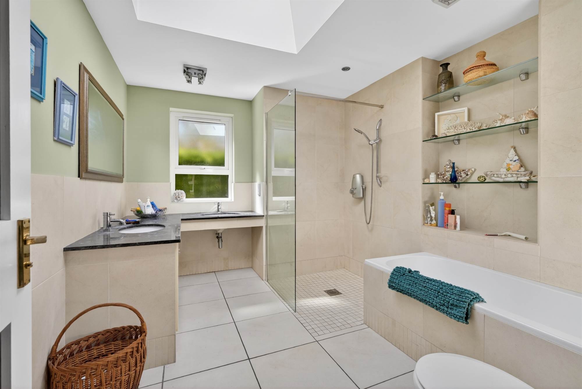 White suite comprising low flush wc, Jack and Jill vanity unit with granite worktop and built-in cabinet below, walk-in shower with Aqua Stream shower unit, soak away, porcelain tiled floor, tiled bath with chrome mixer tap, built-in shelving, Velux window, heated towel rail, built-in shelving, ceramic tiled floor.