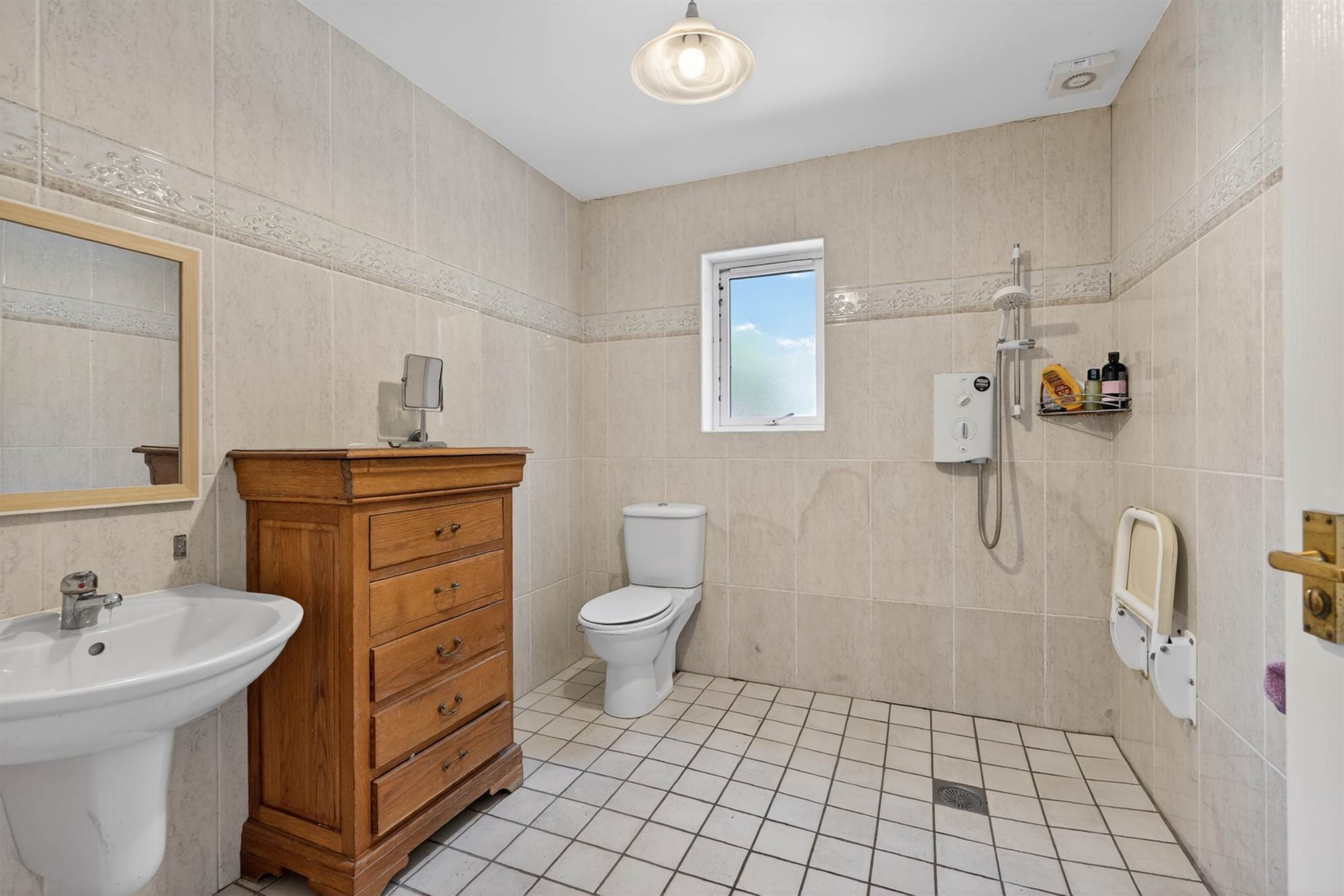 White suite comprising low flush wc, floating wash hand basin with chrome mixer tap, built-in Mira Sport electric shower unit, soak away, ceramic tiled floor, fully tiled walls, extractor fan.