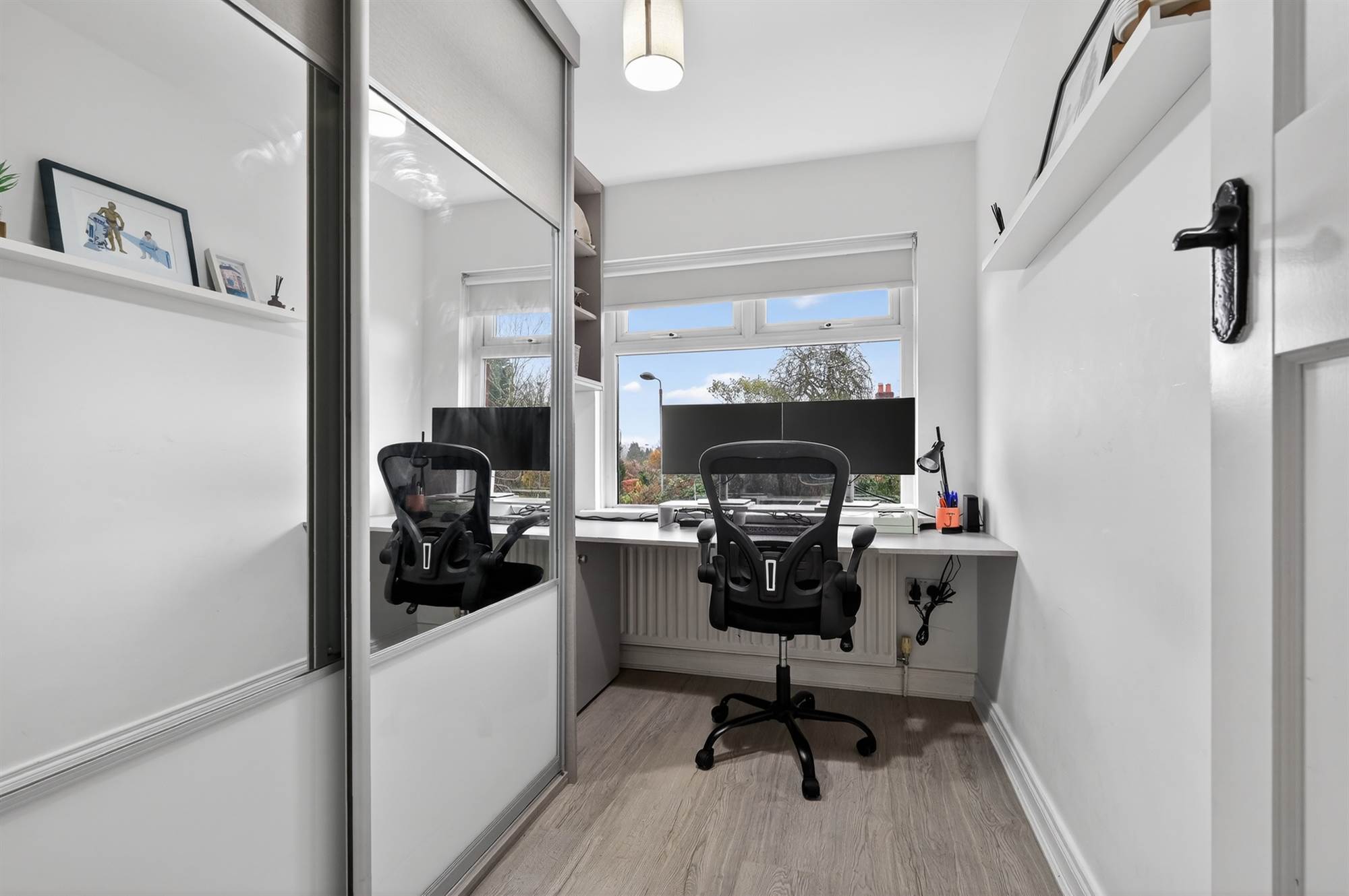 Laminate wooden floor. Built-in mirror fronted sliding robes and built-in shelving.