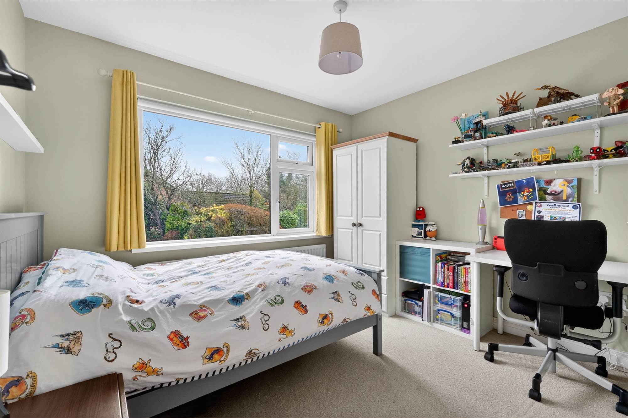 Outside, the home enjoys generous south-facing gardens framed by mature trees and shrubs, along with a front driveway and attached garage.