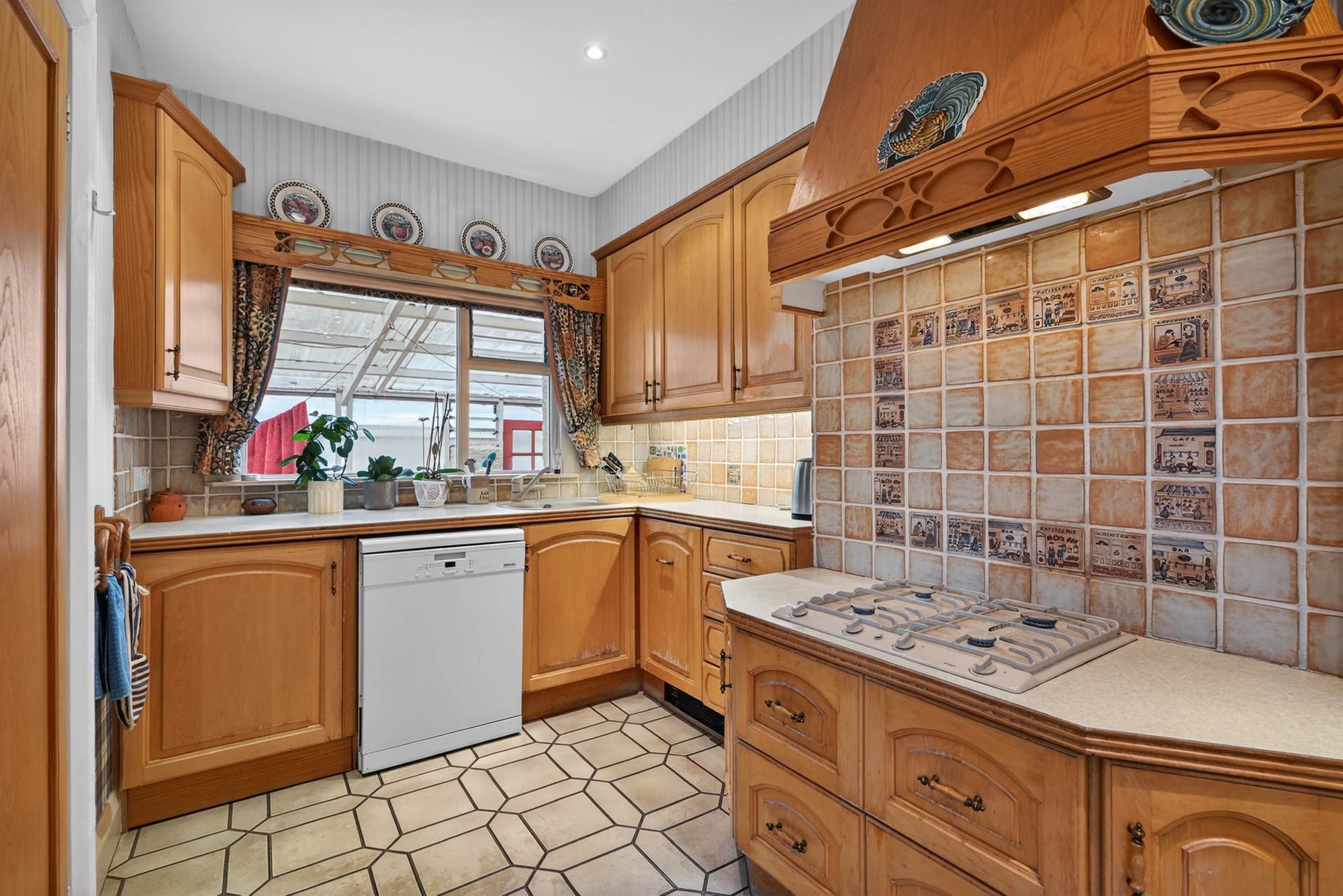 Range of high and low level units, work surfaces, sink and drainer, four ring gas hob with extractor fan above, integrated Neff oven, integrated fridge, plumbed for dishwasher, part tiled walls, ceramic tiled floor, low voltage spotlights, built-in breakfast bar.