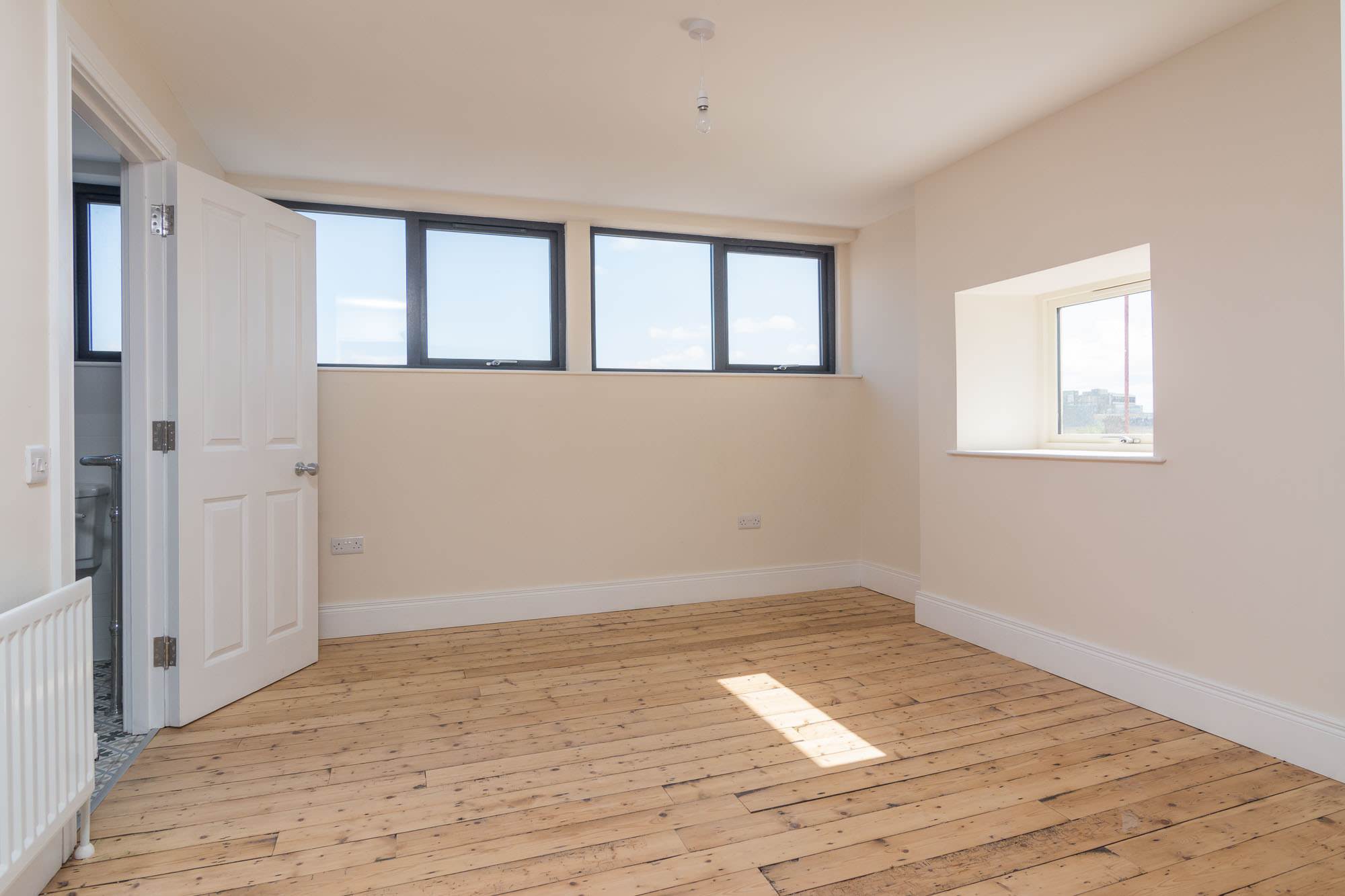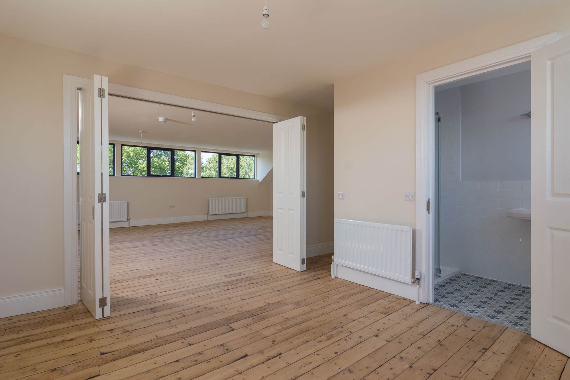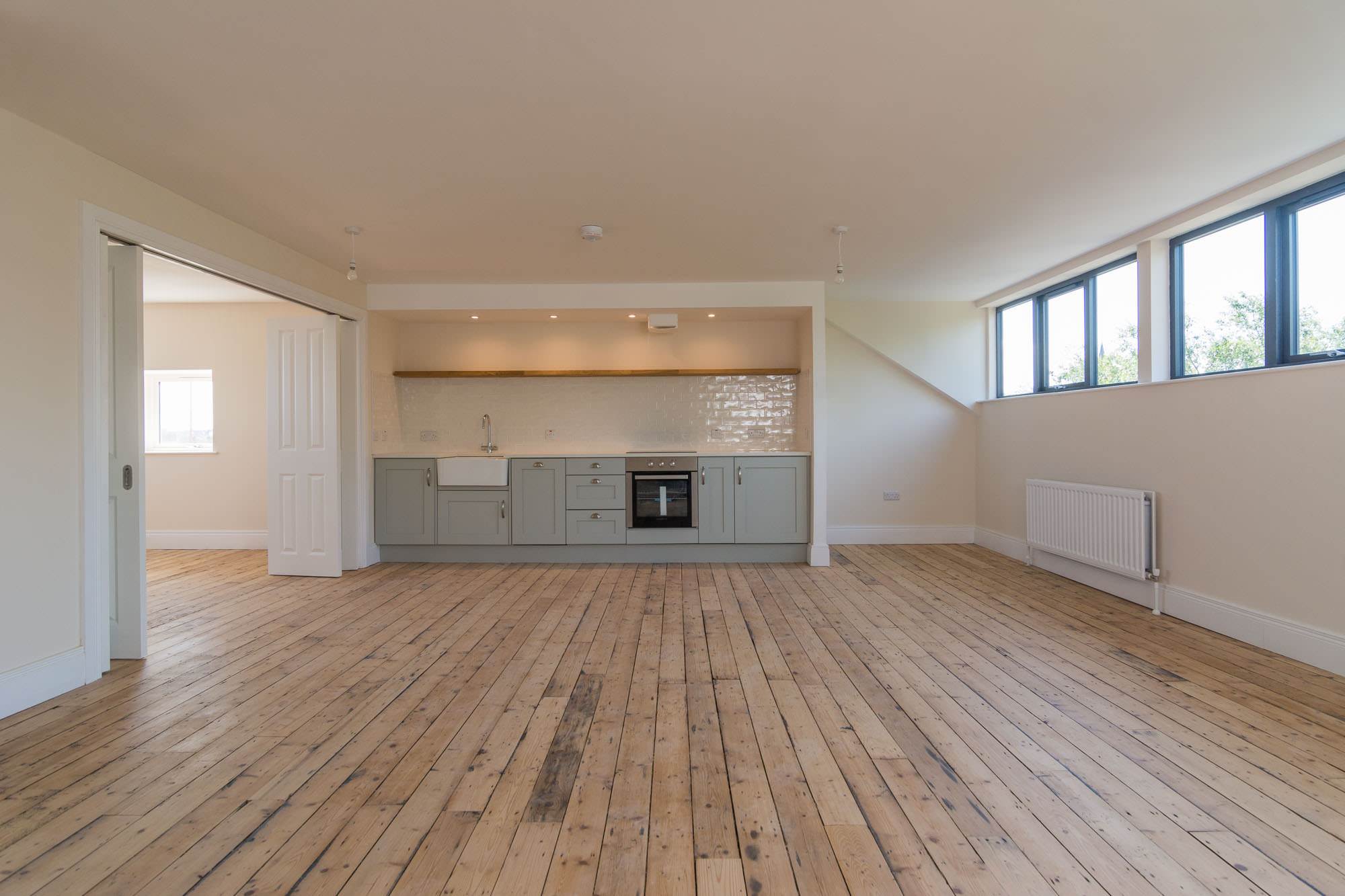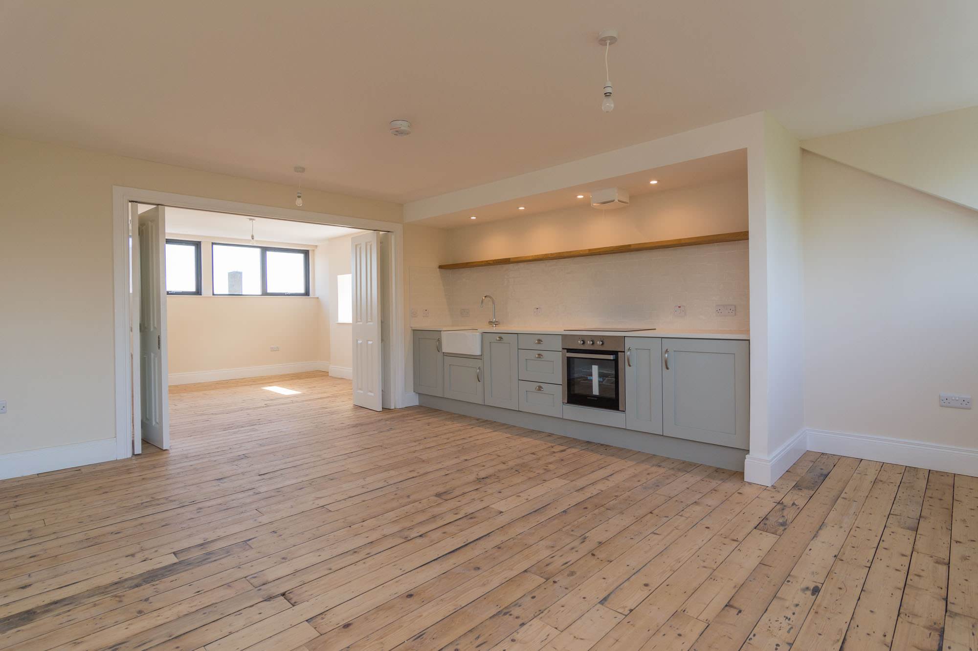 Apartment 4 is a generous 1 bedroom apartment of the top floor. There is a modern kitchen open to a large liunger with space for dining. The spacious double bedroom with stylish ensuite, can be separated from the main living area with concertina doors, meaning the apartment can be fully open, or closed off. There is also a utility room/WC.