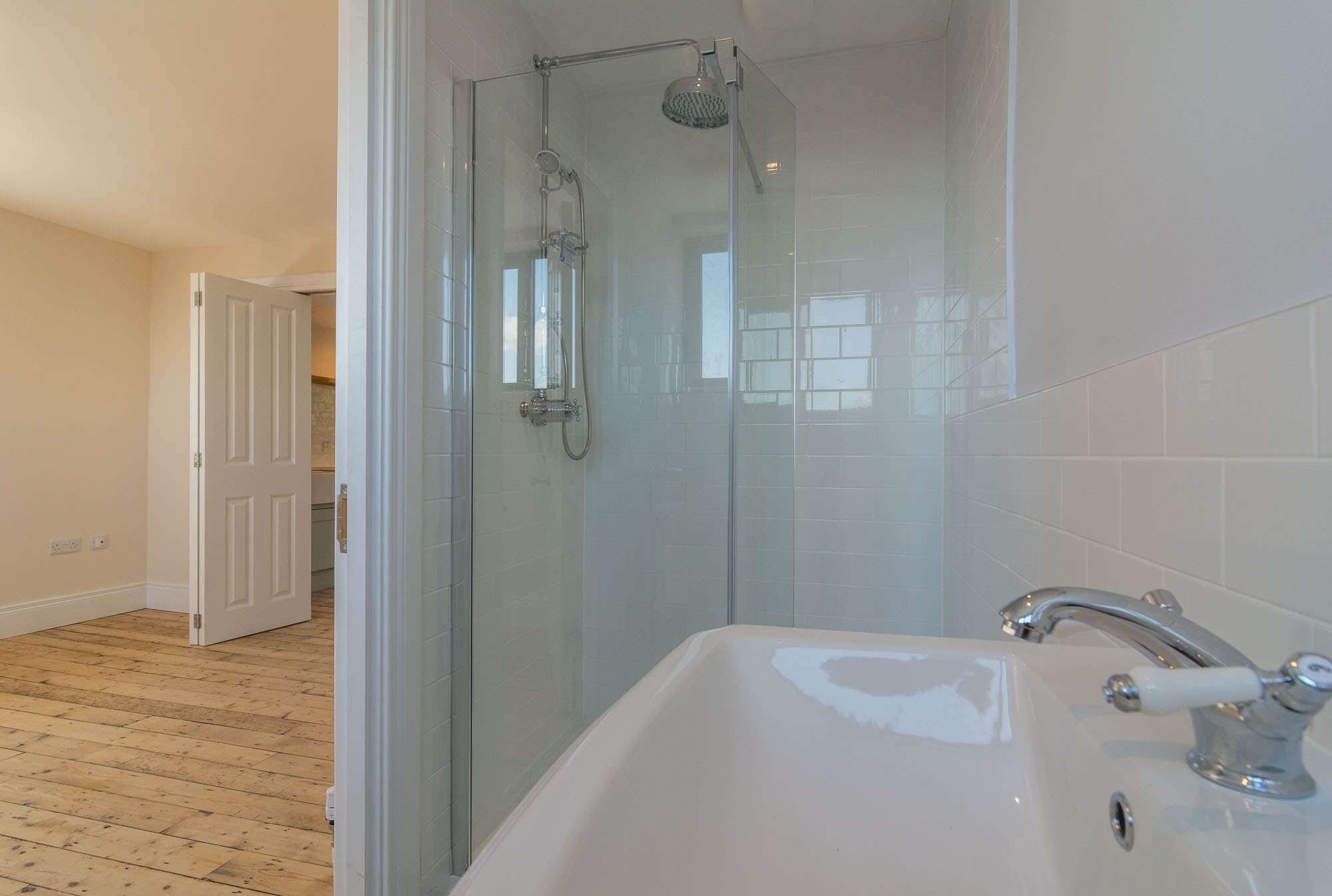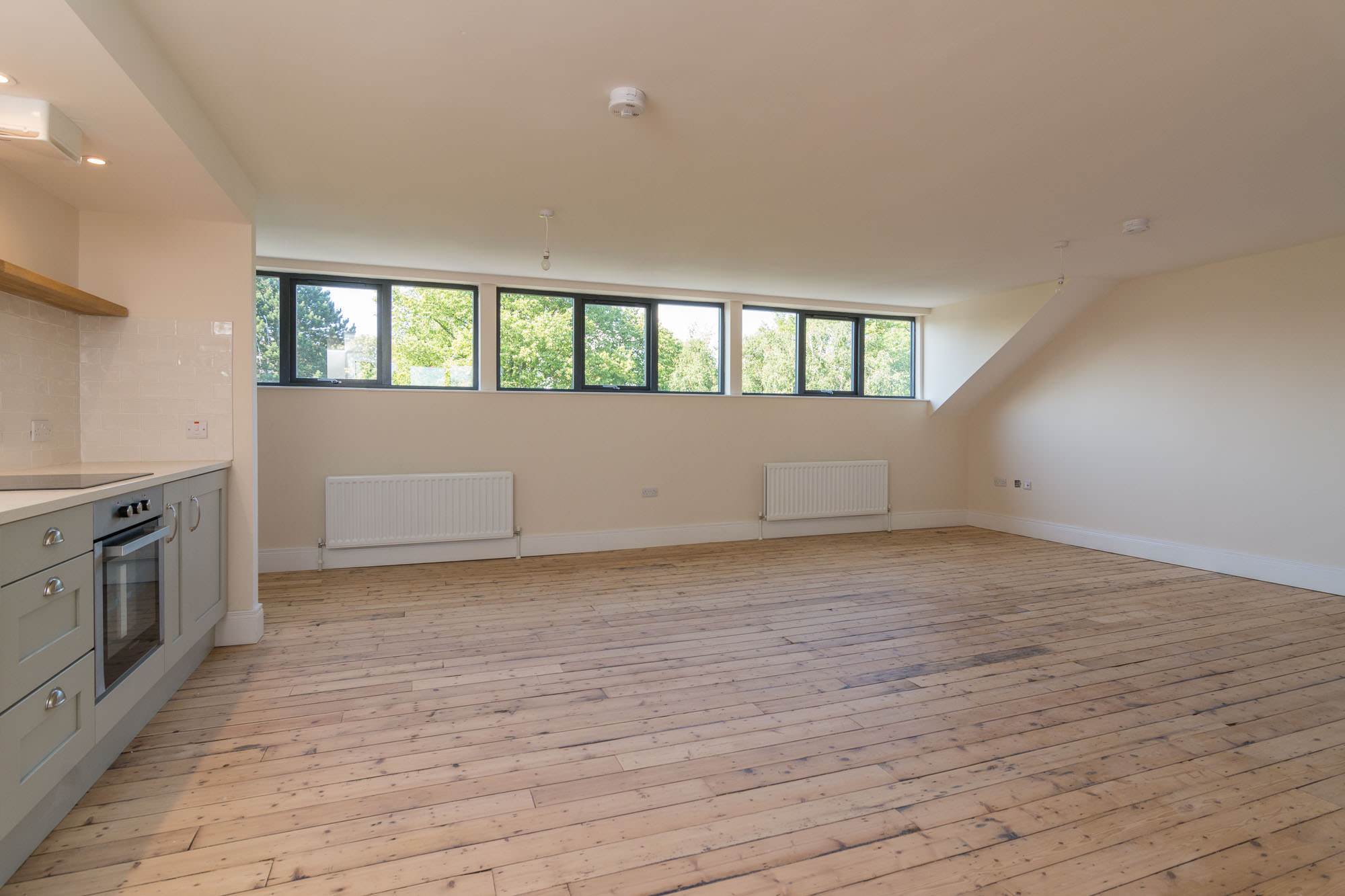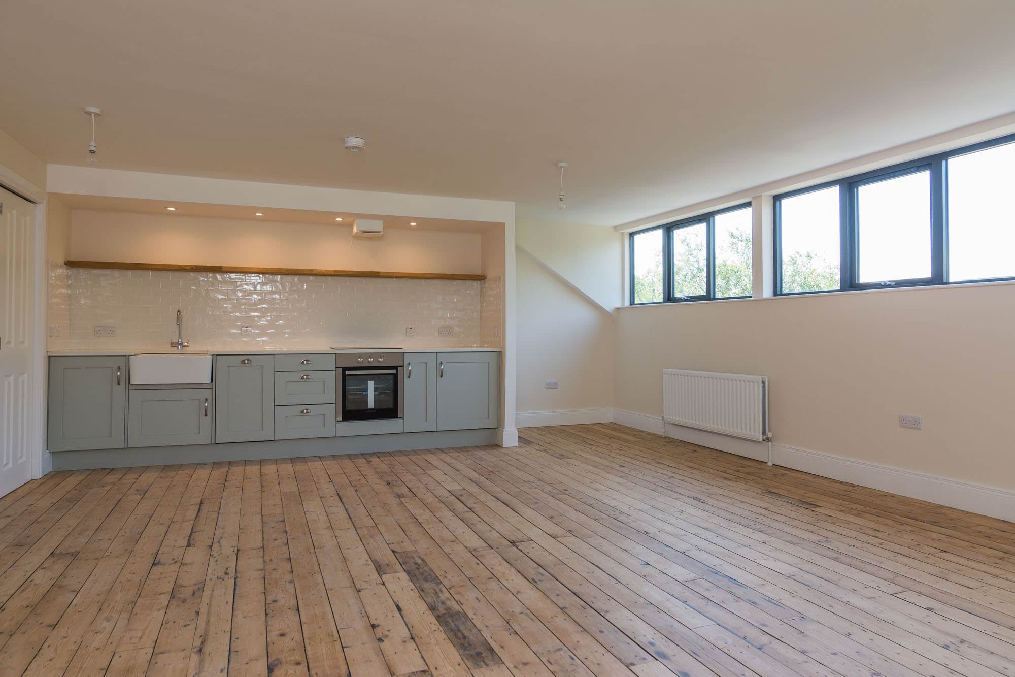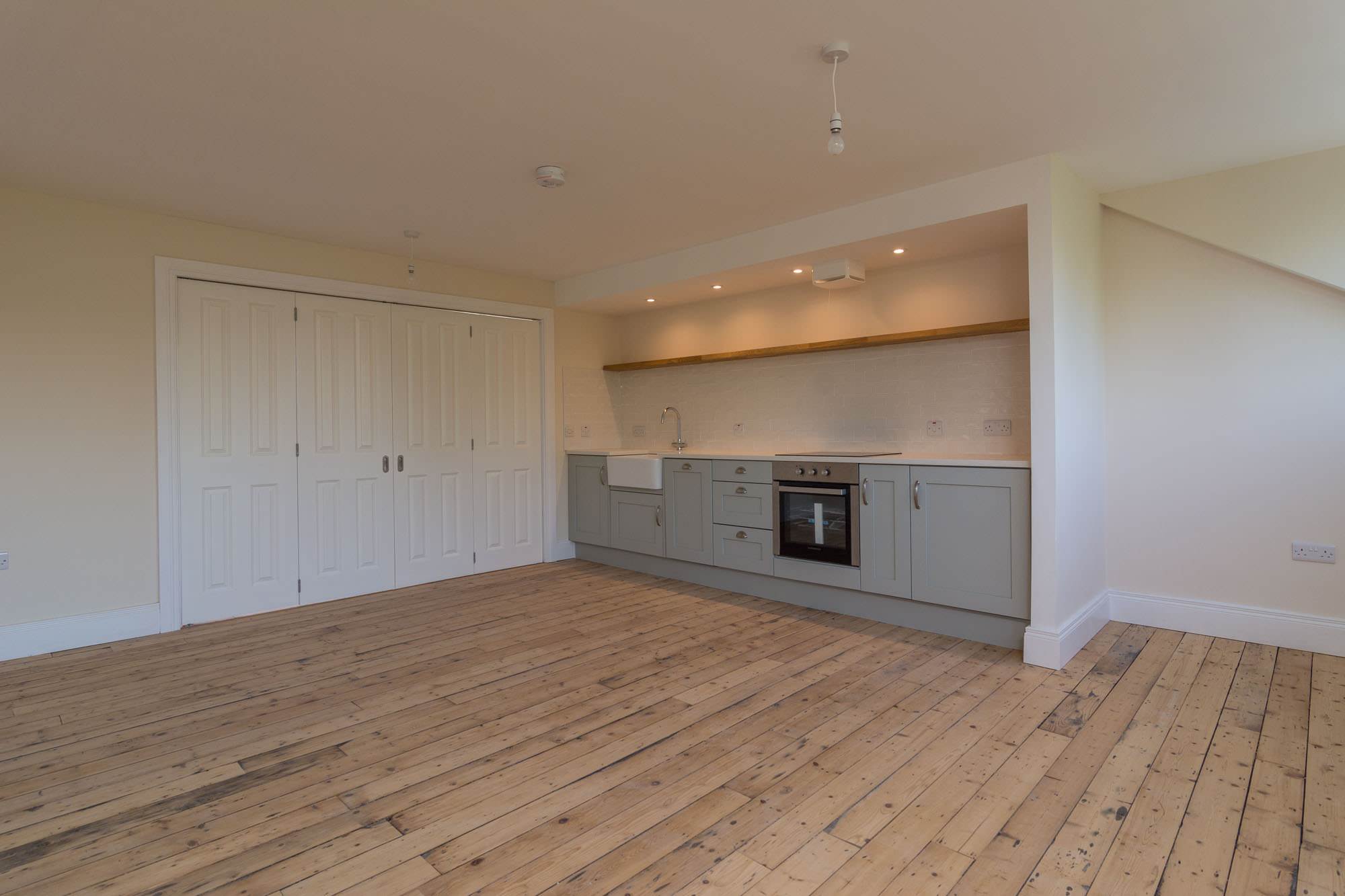 Apartment 4 is a generous 1 bedroom apartment of the top floor. There is a modern kitchen open to a large liunger with space for dining. The spacious double bedroom with stylish ensuite, can be separated from the main living area with concertina doors, meaning the apartment can be fully open, or closed off. There is also a utility room/WC.