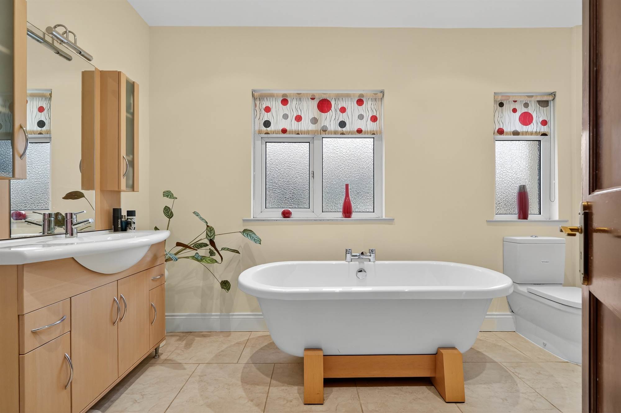 White suite comprising low flush wc, free standing bath on wooden feet, vanity unit with wash hand basin, fully tiled shower cubicle, ceramic tiled floor, low voltage spotlights, heated towel rail.
