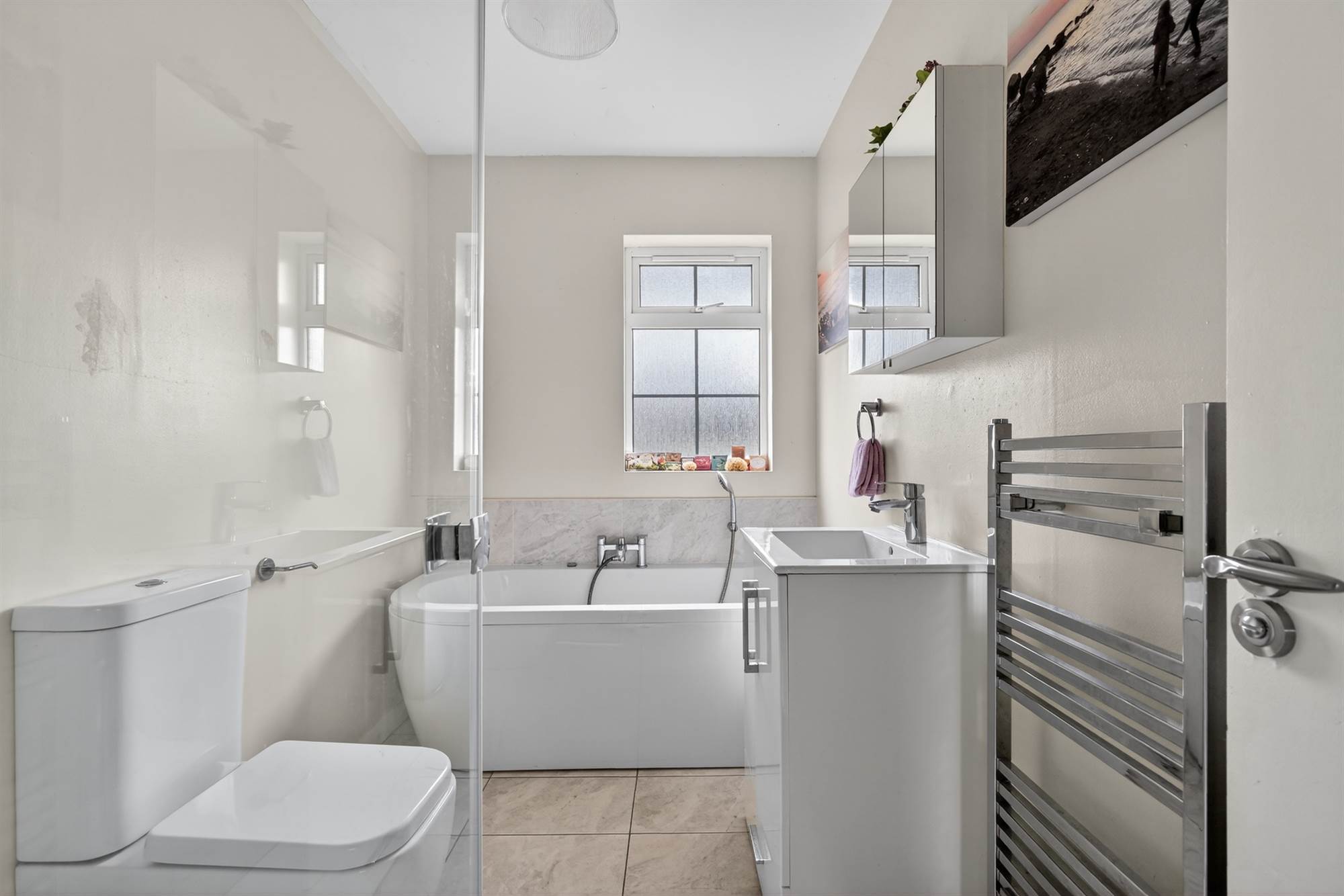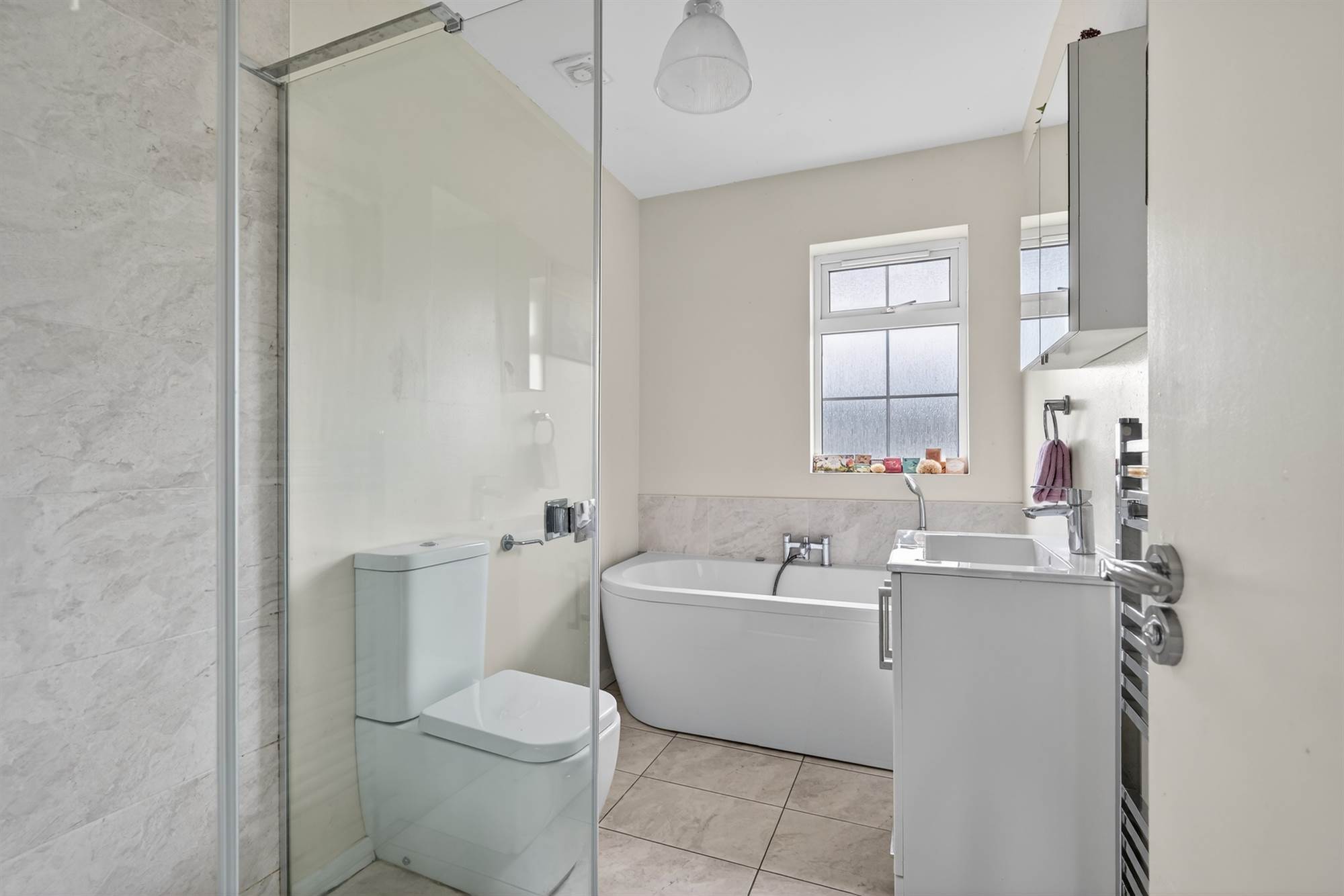 Free standing bath with mixer tap and telephone hand shower, double shower cubicle, wash hand basin, low flush wc, shower cubicle, heated towel rail style radiator, ceramic tiled floor.