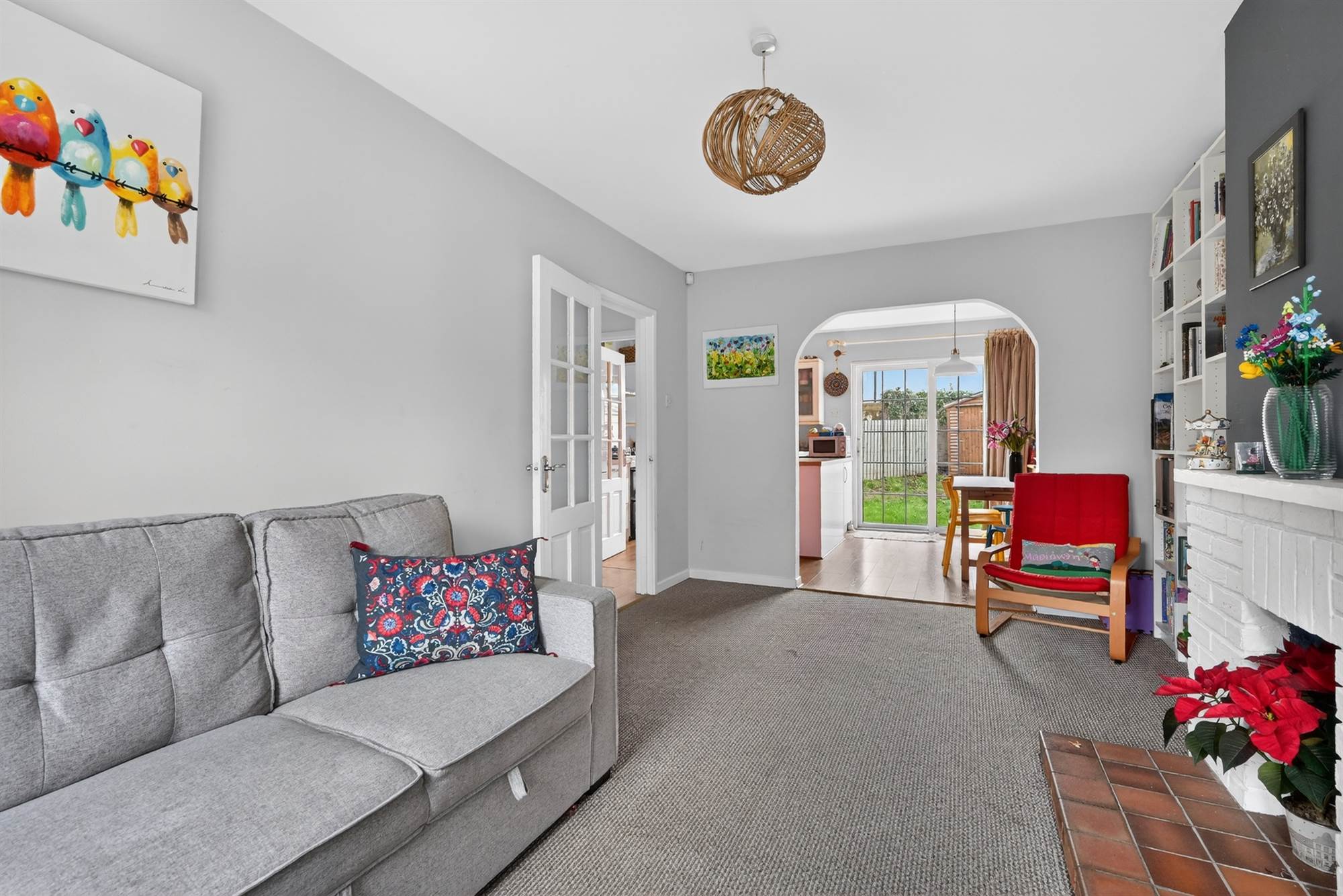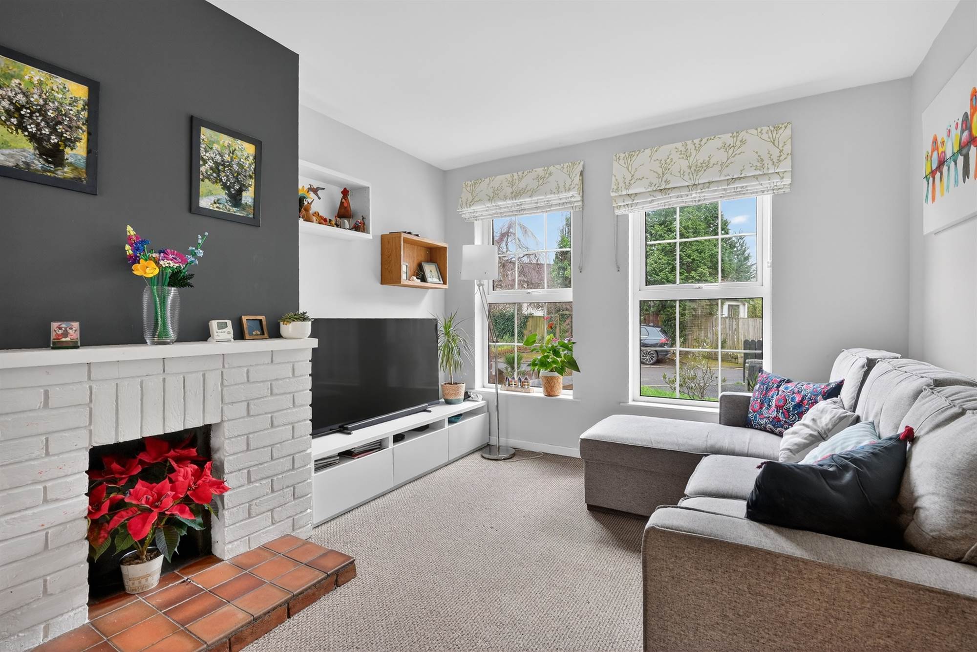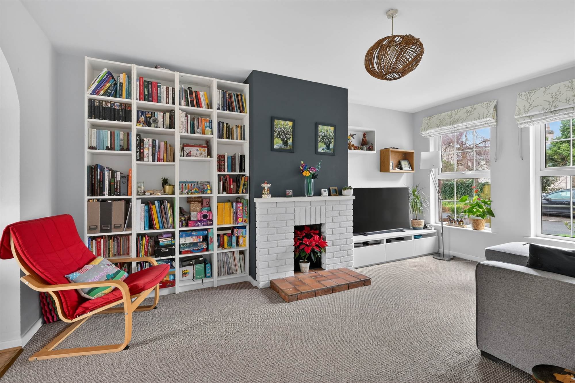 Feature brick fireplace, tiled hearth. Archway to . . .