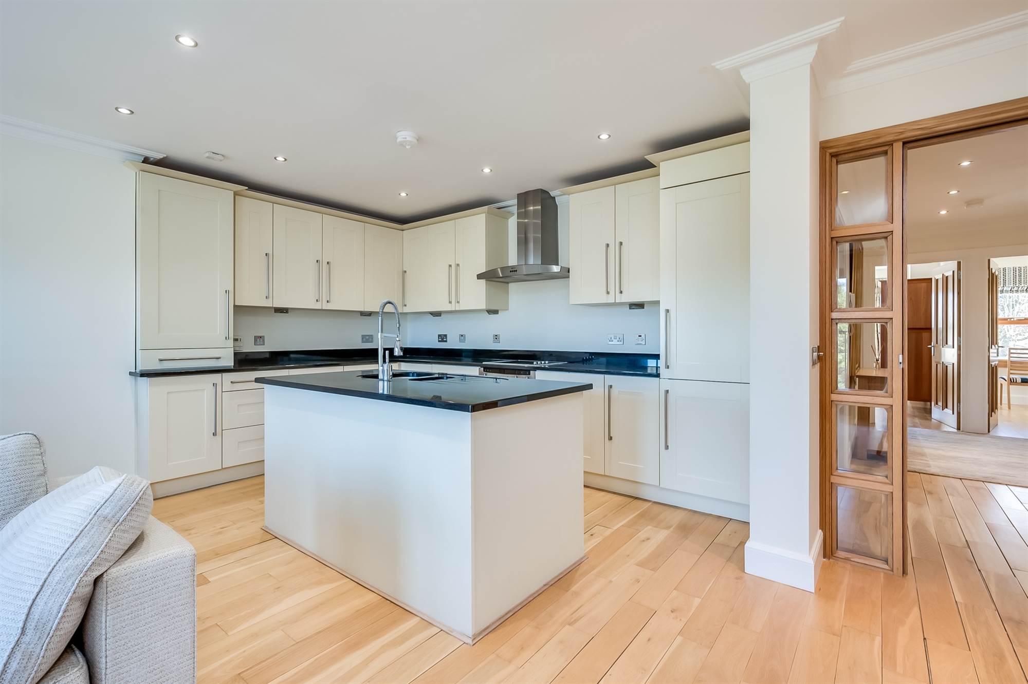 Open plan to Modern Fitted Kitchen with Range of Integrated Appliances and Island Unit