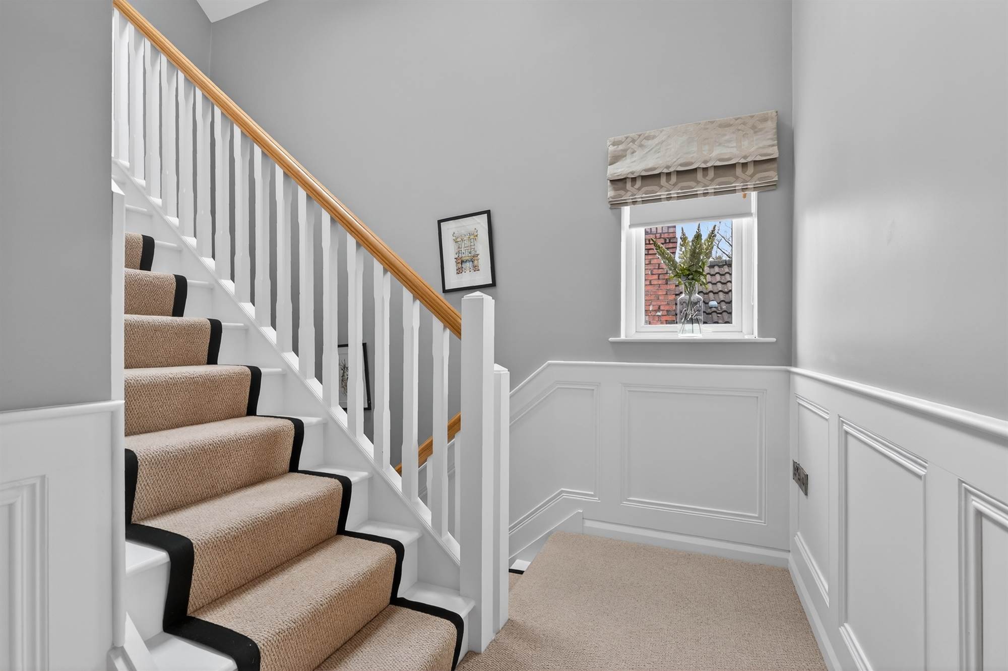 Oak herringbone style floor, storage understairs, part panelled walls.