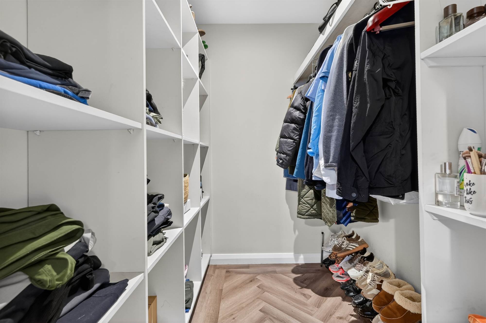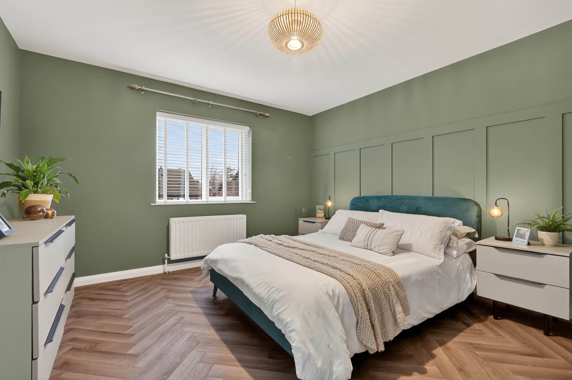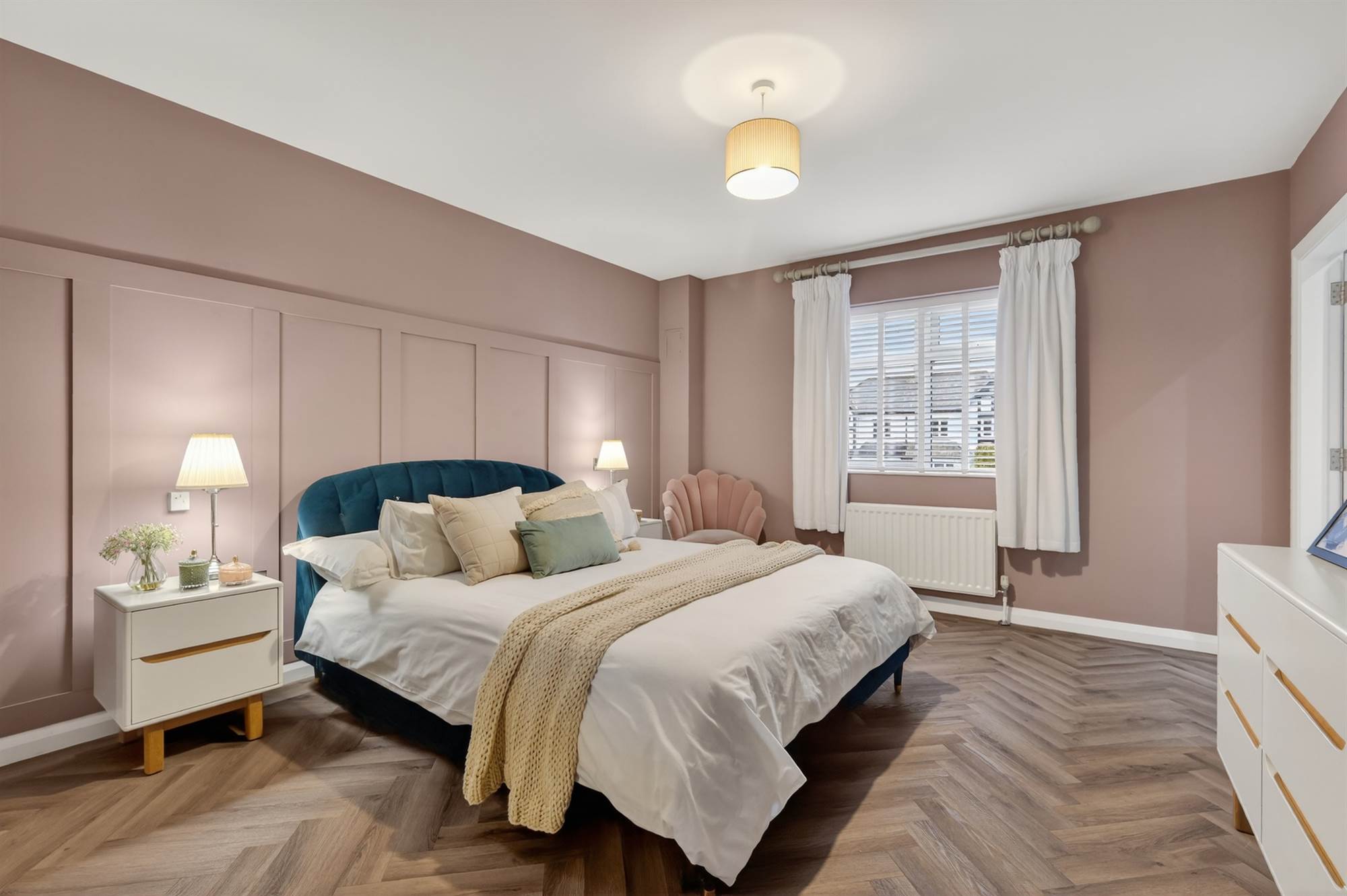 Oak herringbone style floor, walk in dressing room with excellent storage and built in cupboards.
