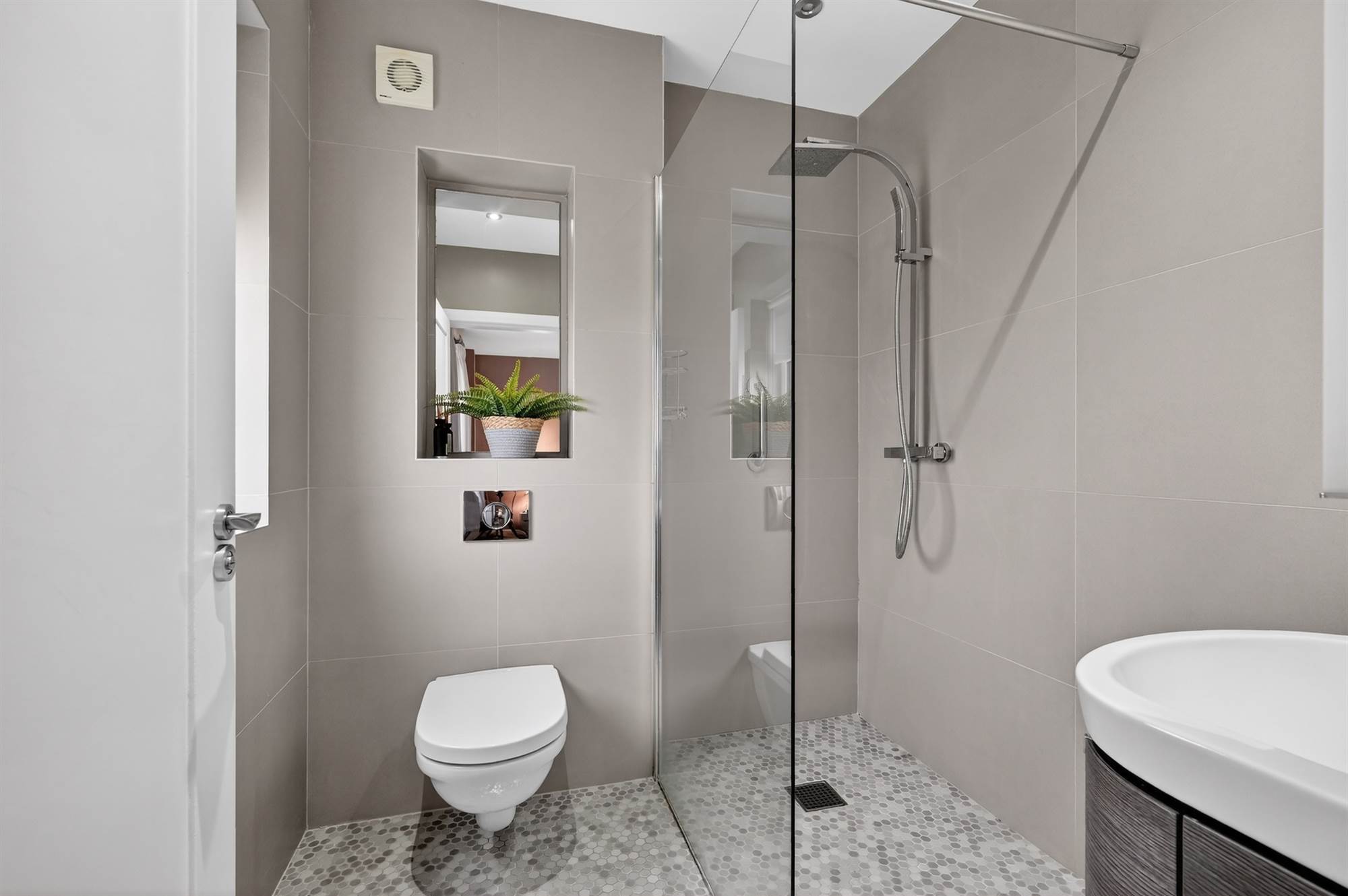 White suite comprising close coupled WC, vanity unit with chrome mixer tap, built in cabinet below, walk in shower with soak away, chrome overhead shower unit, extractor fan, ceramic tiled floor, fully tiled walls.