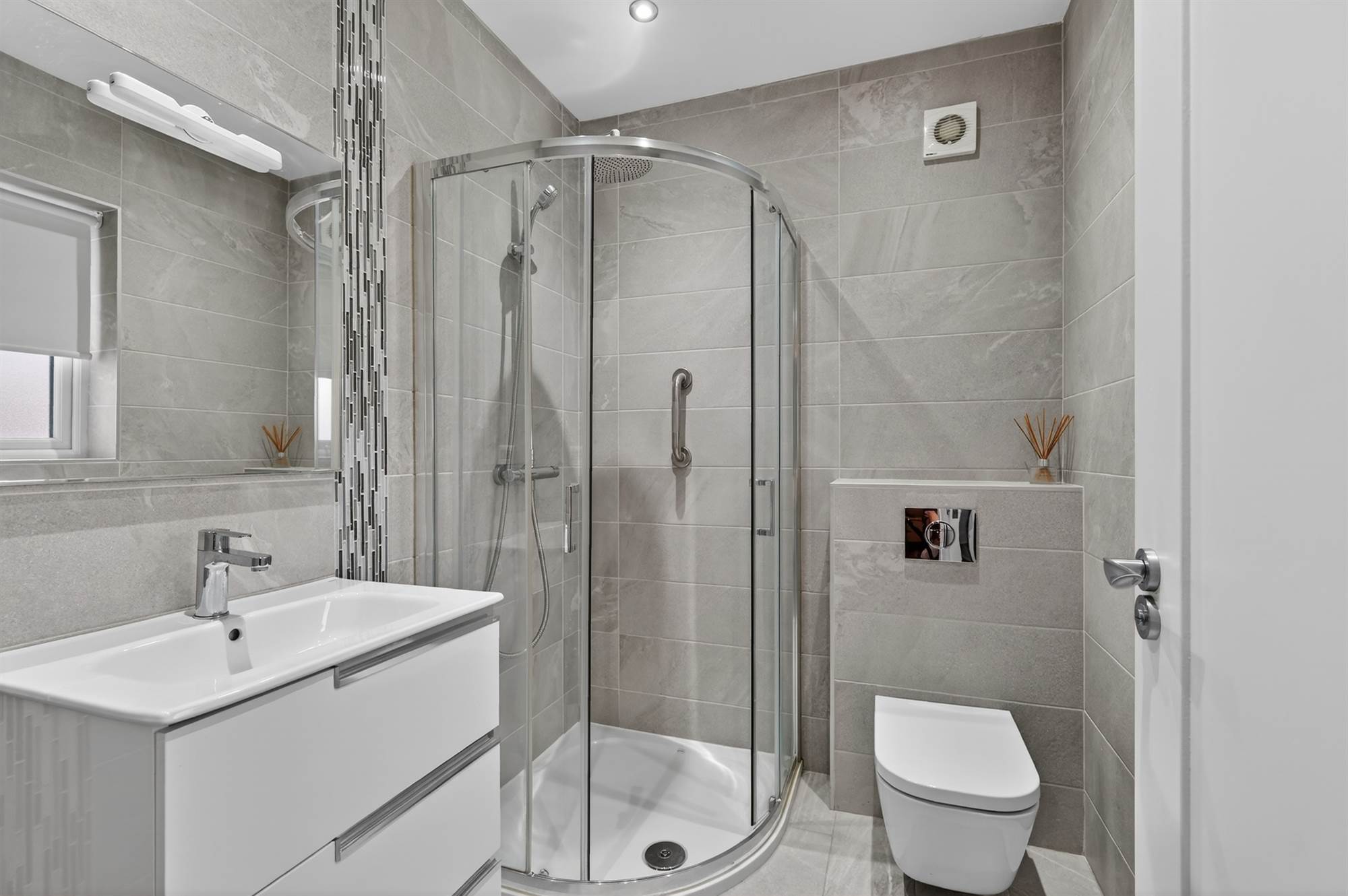 White suite comprising close coupled WC, vanity unit with chrome mixer tap and cabinet below, built in shower cubicle with chrome over head shower unit, fully tiled walls, ceramic tiled floor, low voltage spotlighting, extractor fan, heated towel rail.