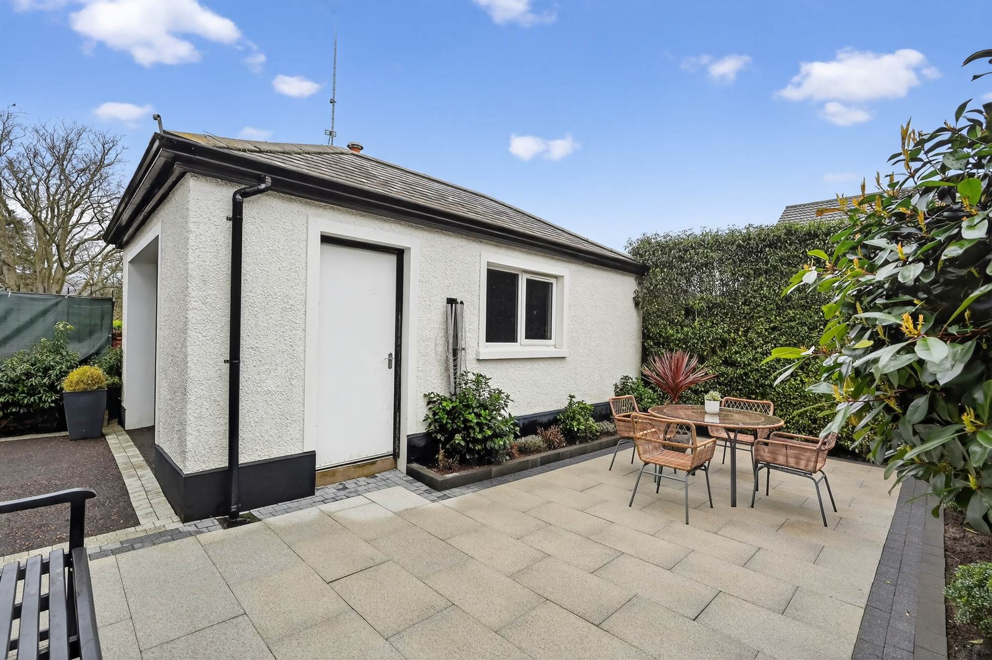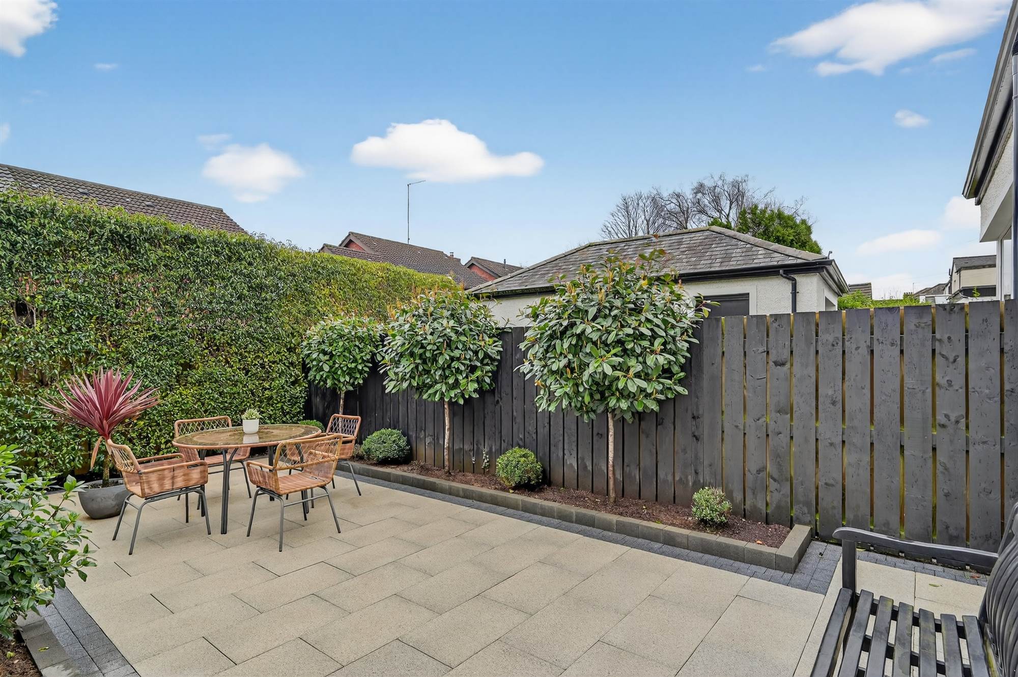 Enclosed rear garden laid in Granite paved patio area ideal for BBQing and outdoor entertaining, flowerbeds with shrubs and mature trees.