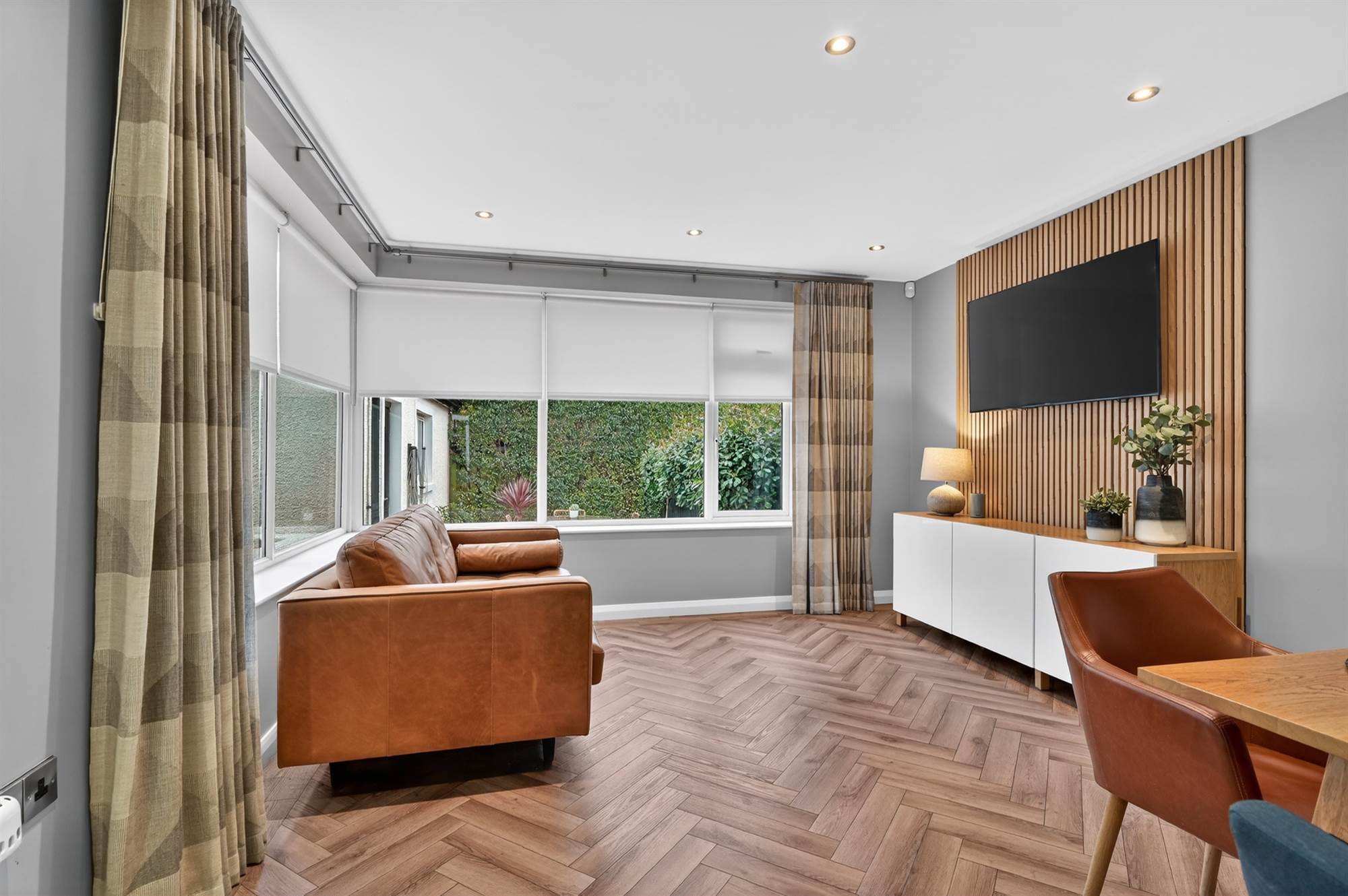 SUN ROOM: Feature wood panelled display TV wall, outlook to rear garden, low voltage spotlighting, dual aspect windows, upvc access door to rear garden.