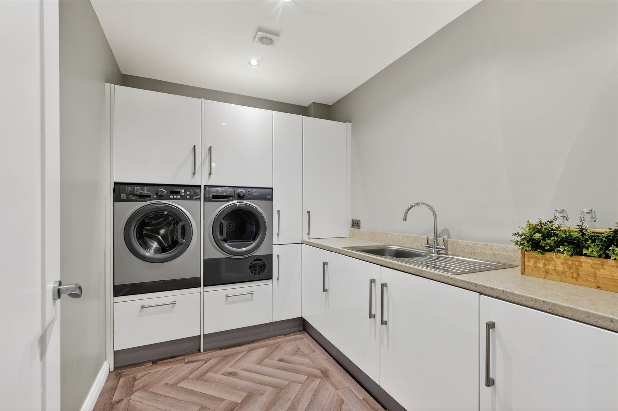 Range of high and low level units, stainless steel single drainer sink unit, laminate worktops, raised washing machine and vented for tumble dryer, herringbone style floor.