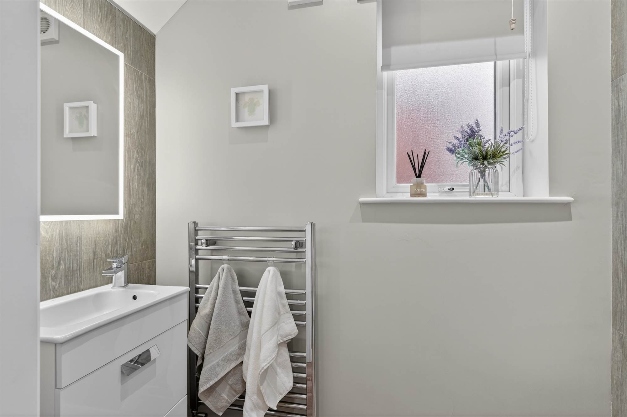 Comprising low flush W, chrome heated towel rail, vanity unit with chrome mixer tap, built in cabinet below, tiled splash back, oak herringbone style floor.