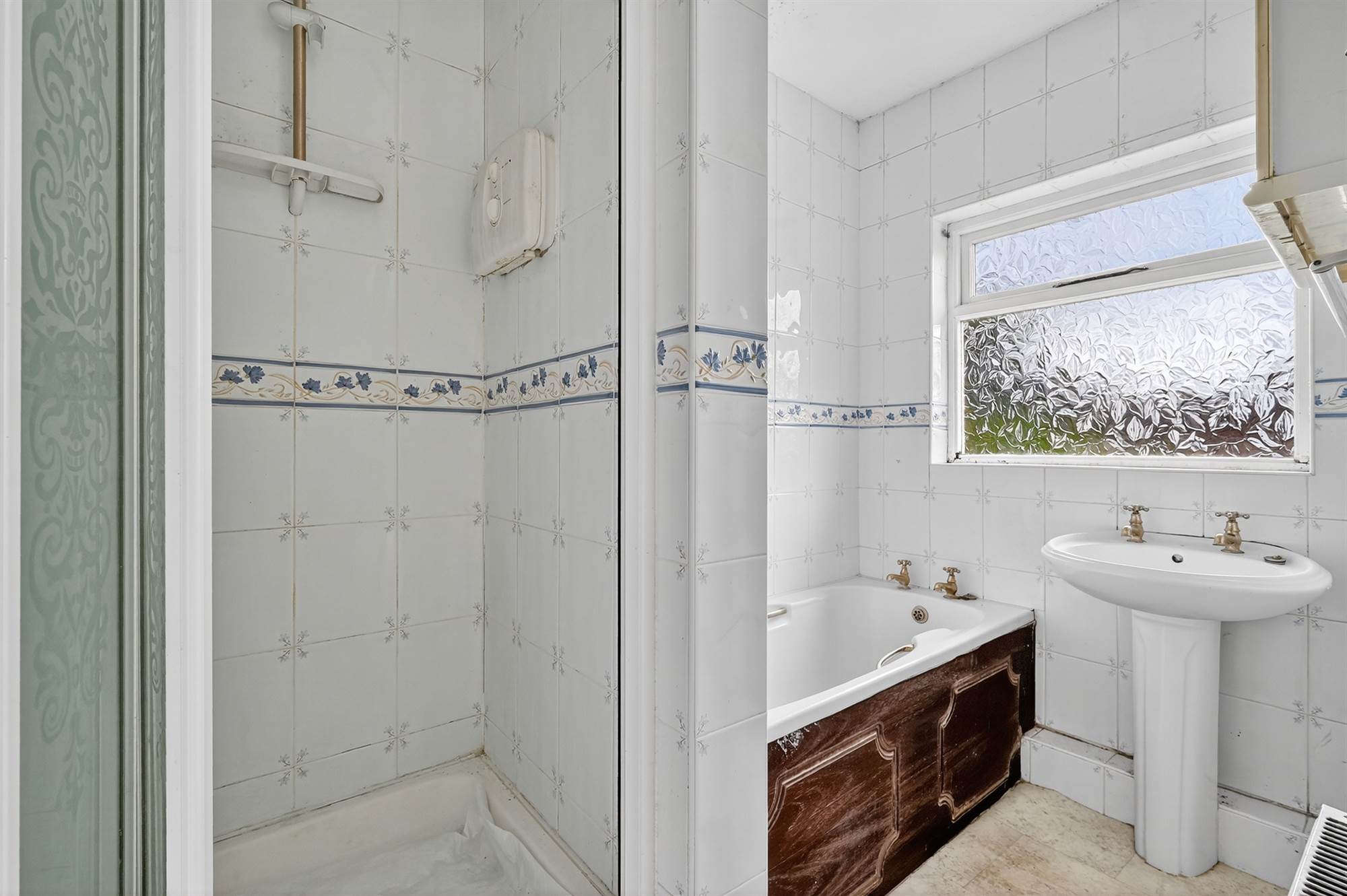 White suite comprising pedestal wash hand basin, panelled bath, fully tiled walls, shower screen, part tiled walls.