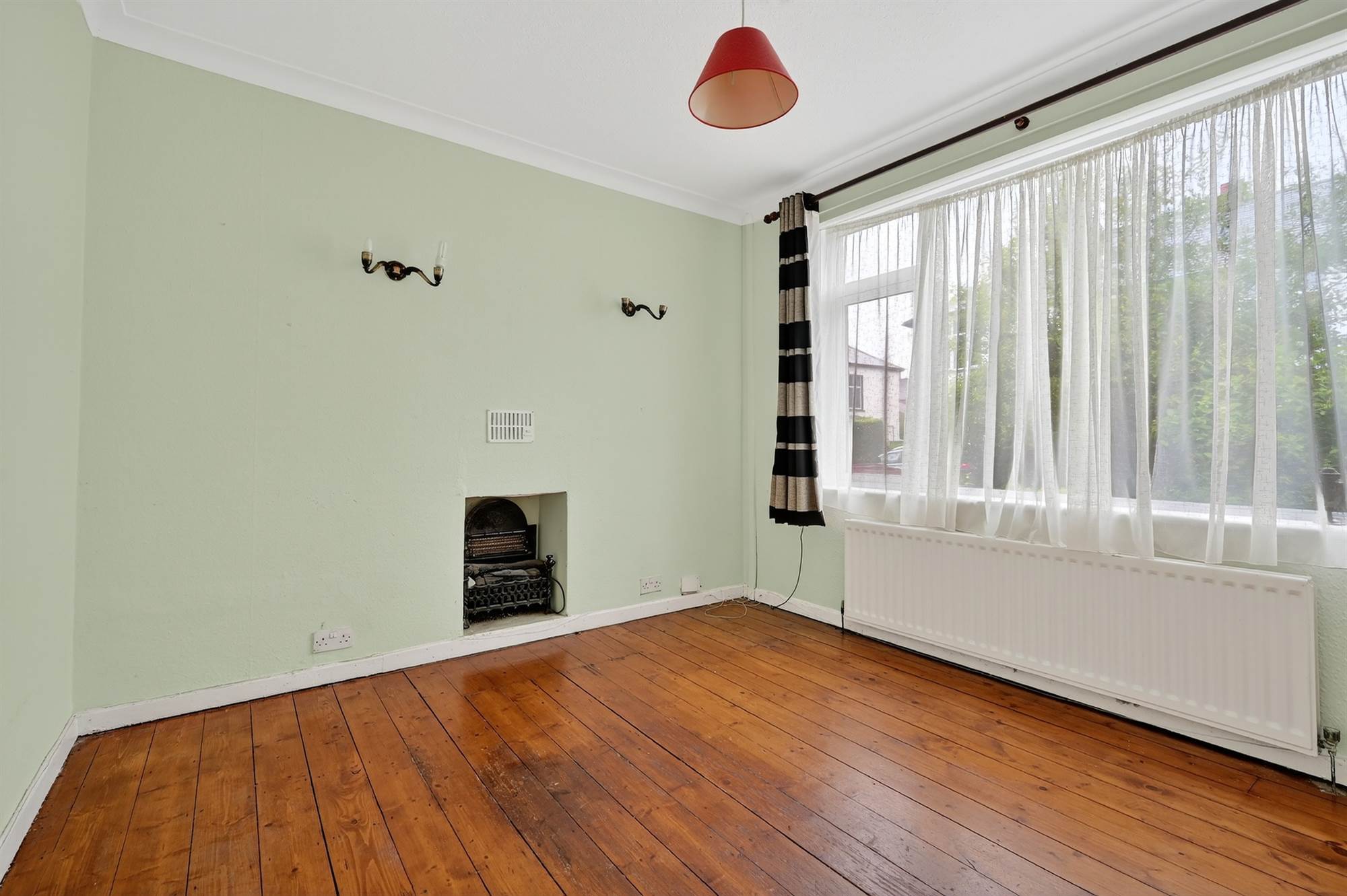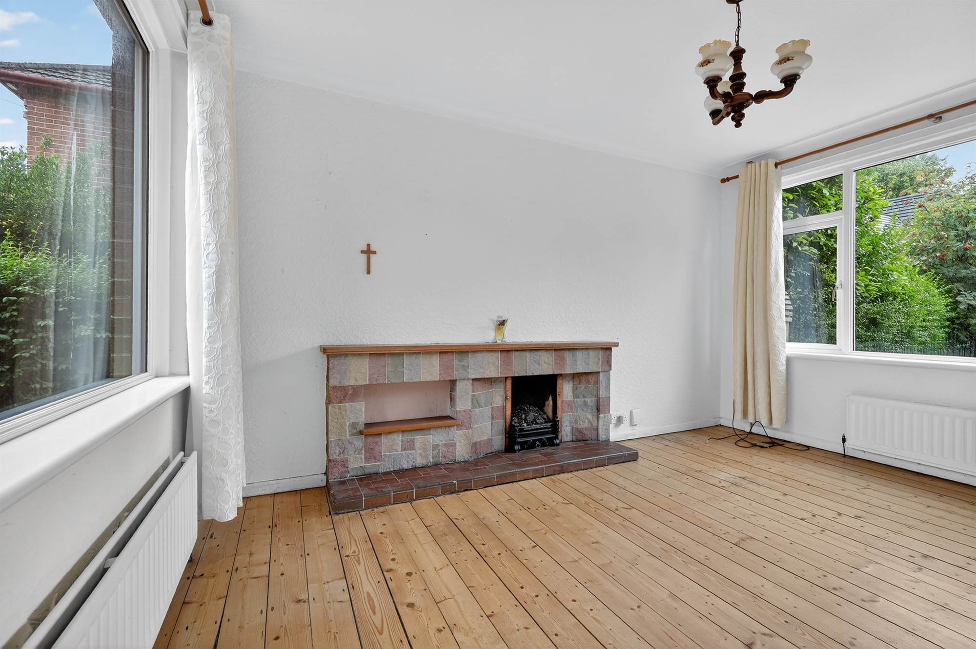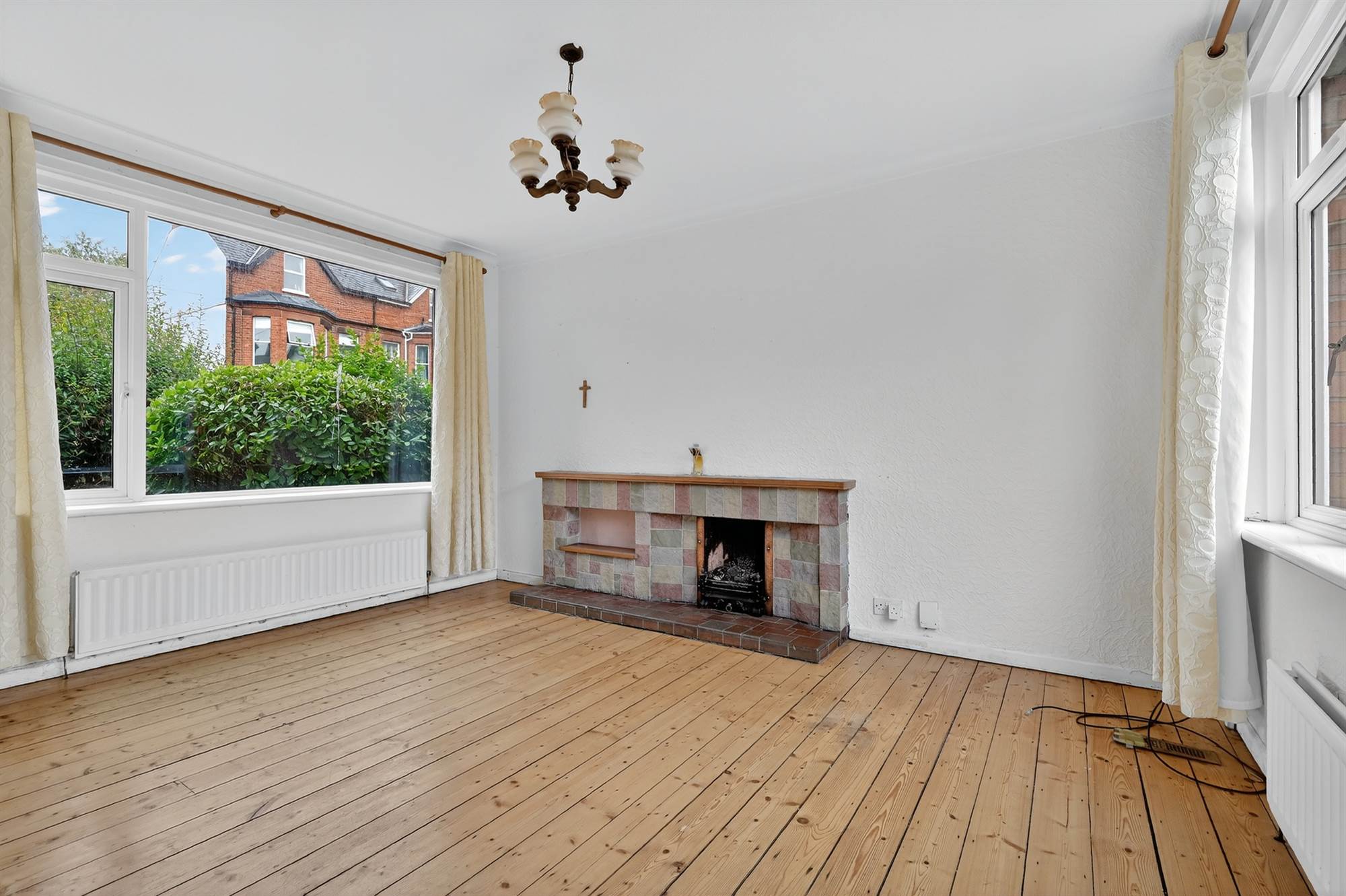 Hole in the wall fireplace, cornice ceiling, sanded and varnished floorboards.