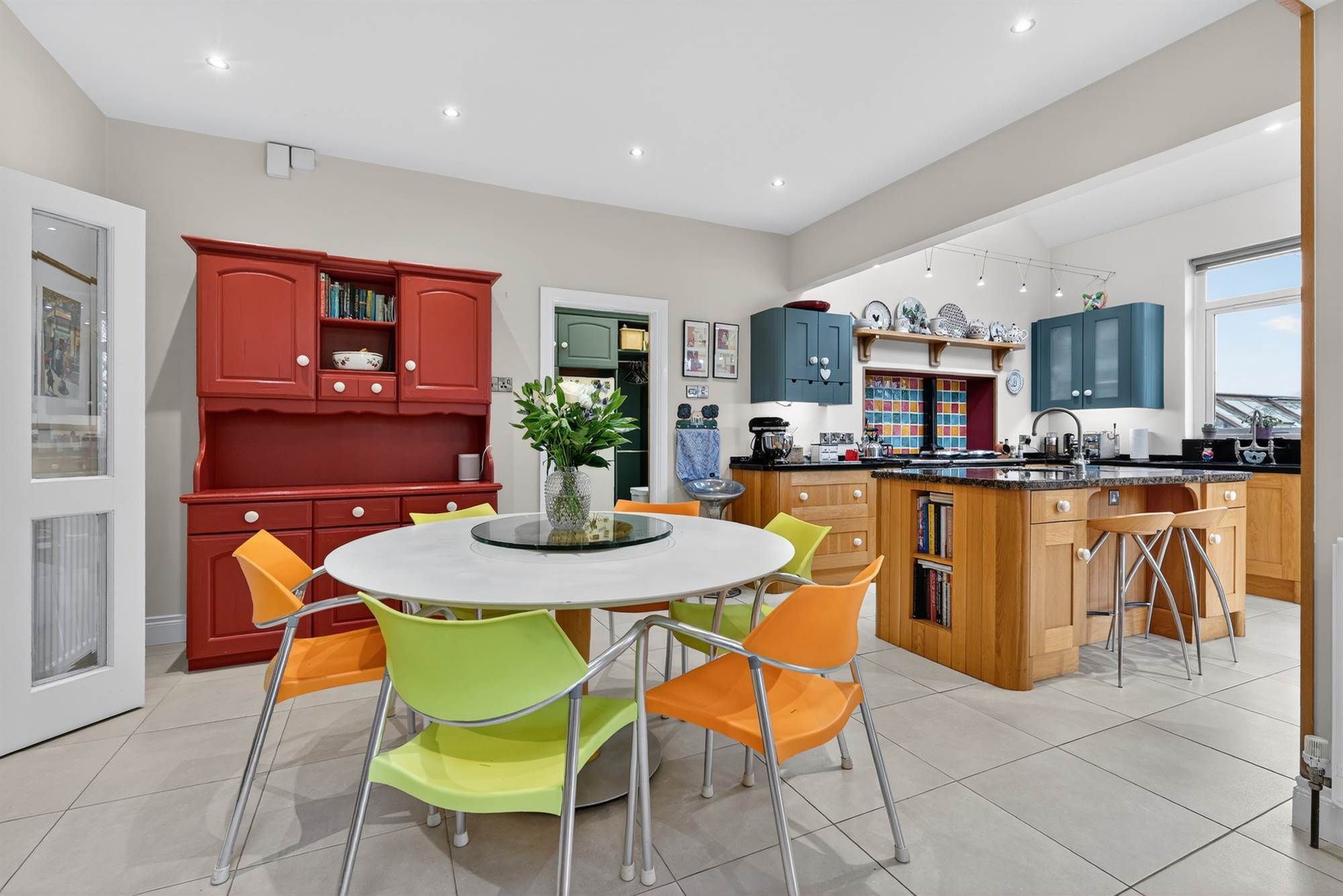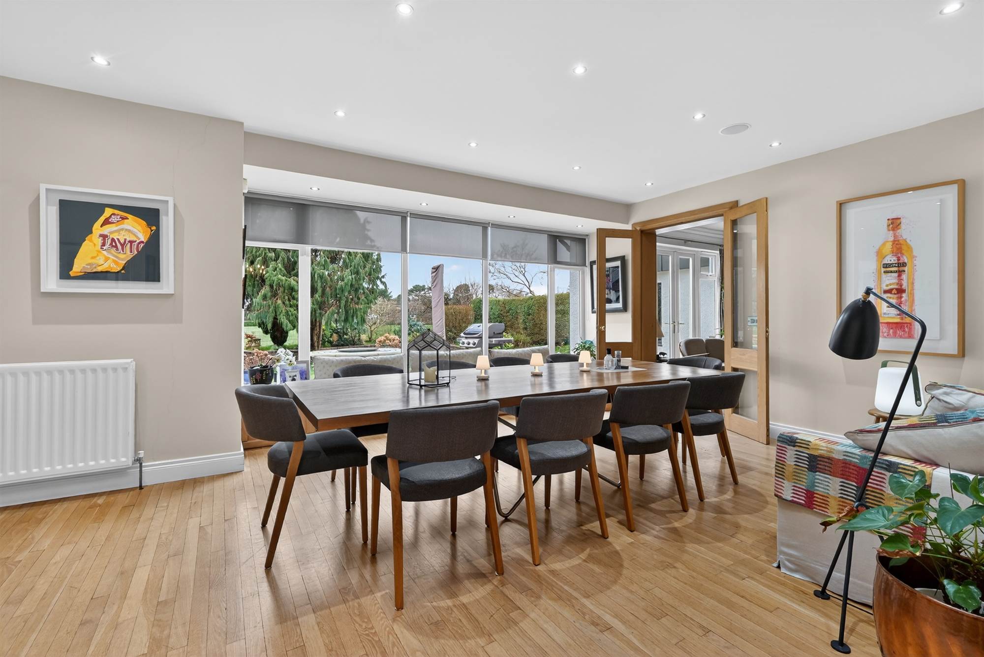 Solid oak kitchen with granite worktops, double drainer stainless steel double sink unit with mixer tap, built-in high level frosted glazed display units, integrated dishwasher, integrated American fridge freezer, oil fired four oven Aga, breakfast island with granite worktop, integrated Neff four ring ceramic hob with Neff electric double oven below, stainless steel sink unit with mixer tap, built-in breakfast bar, ceramic tiled floor, vaulted ceiling with Velux window, uPVC double glazed French doors to rear garden. Open to ample dining and living areas, low voltage spotlights, solid oak wood strip floor, beautiful mature outlook across rear garden and onto RBAI playing fields.