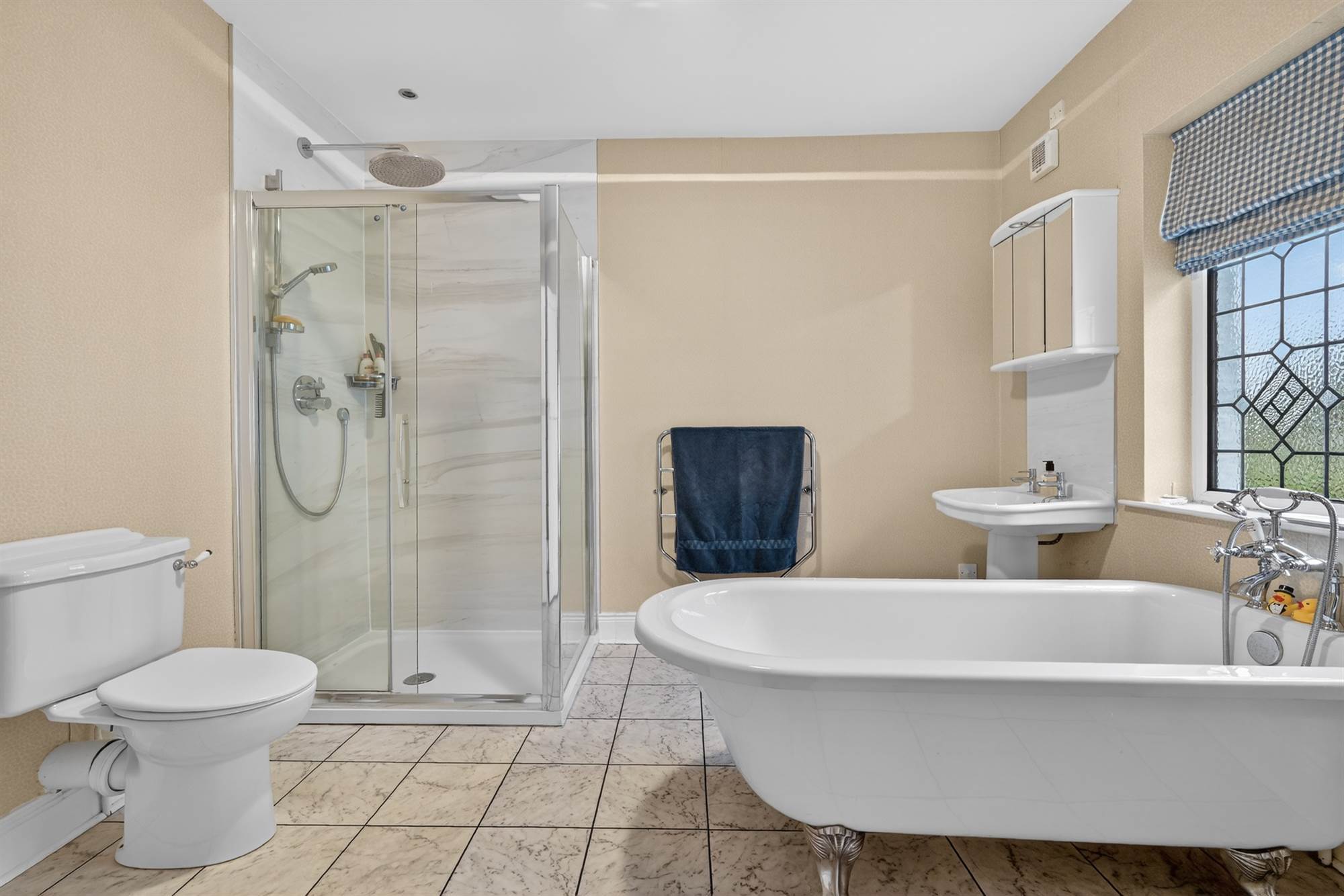 White suite comprising low flush wc, Jack and Jill pedestal wash hand basins with ceramic tiled splashback, roll-top bath, large fully tiled shower cubicle with mains overhead chrome drencher shower head and additional attachment, bidet, bathroom cabinet with power points, ceramic tiled floor, extractor fan.