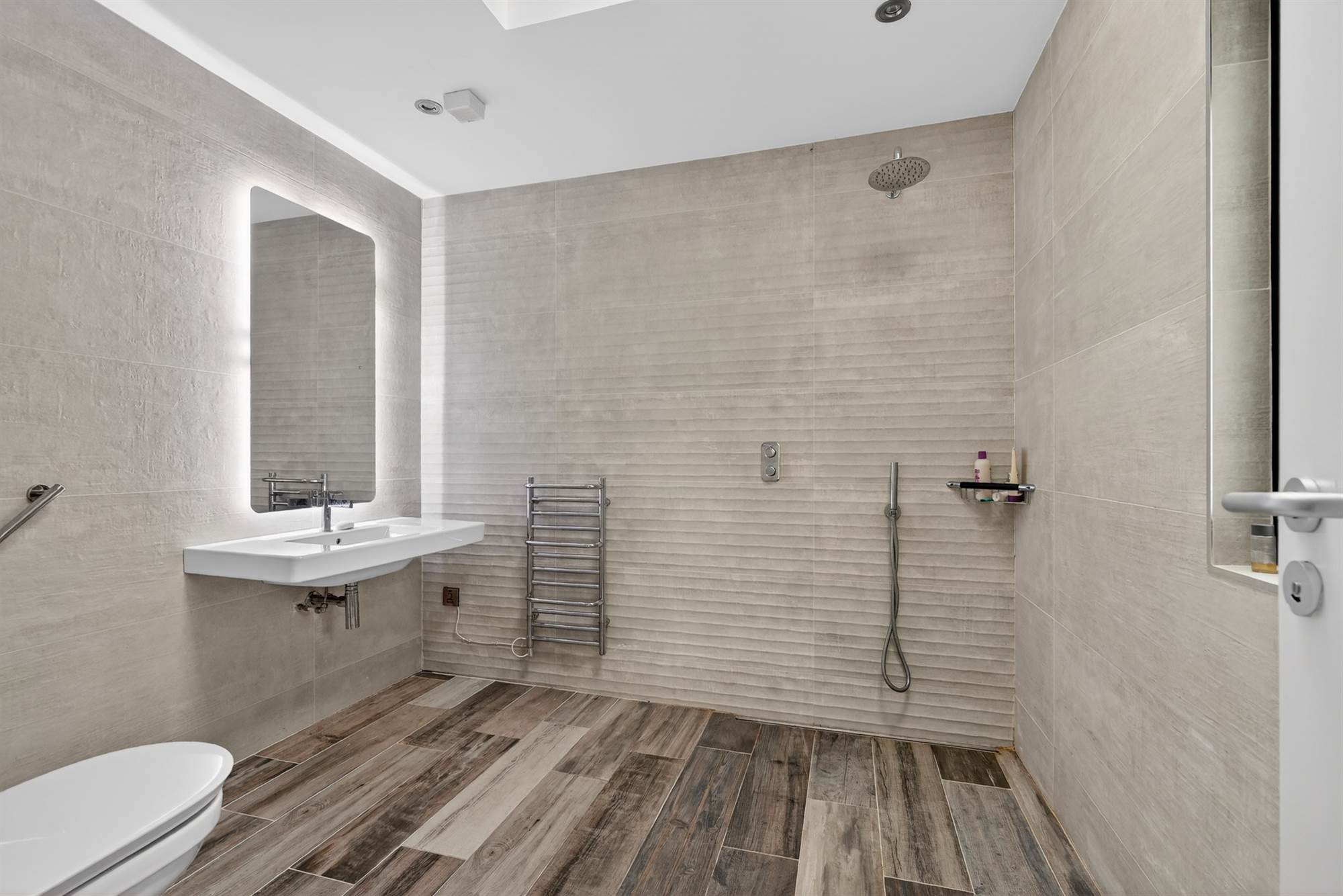 White suite comprising low flush wc, floating wash hand basin, large walk-in shower with chrome overhead drencher shower head and additional attachment, fully tiled walls, ceramic tiled floor, chrome heated towel rail, bathroom cabinet with electric points, glazed leaded window. Access to . . .