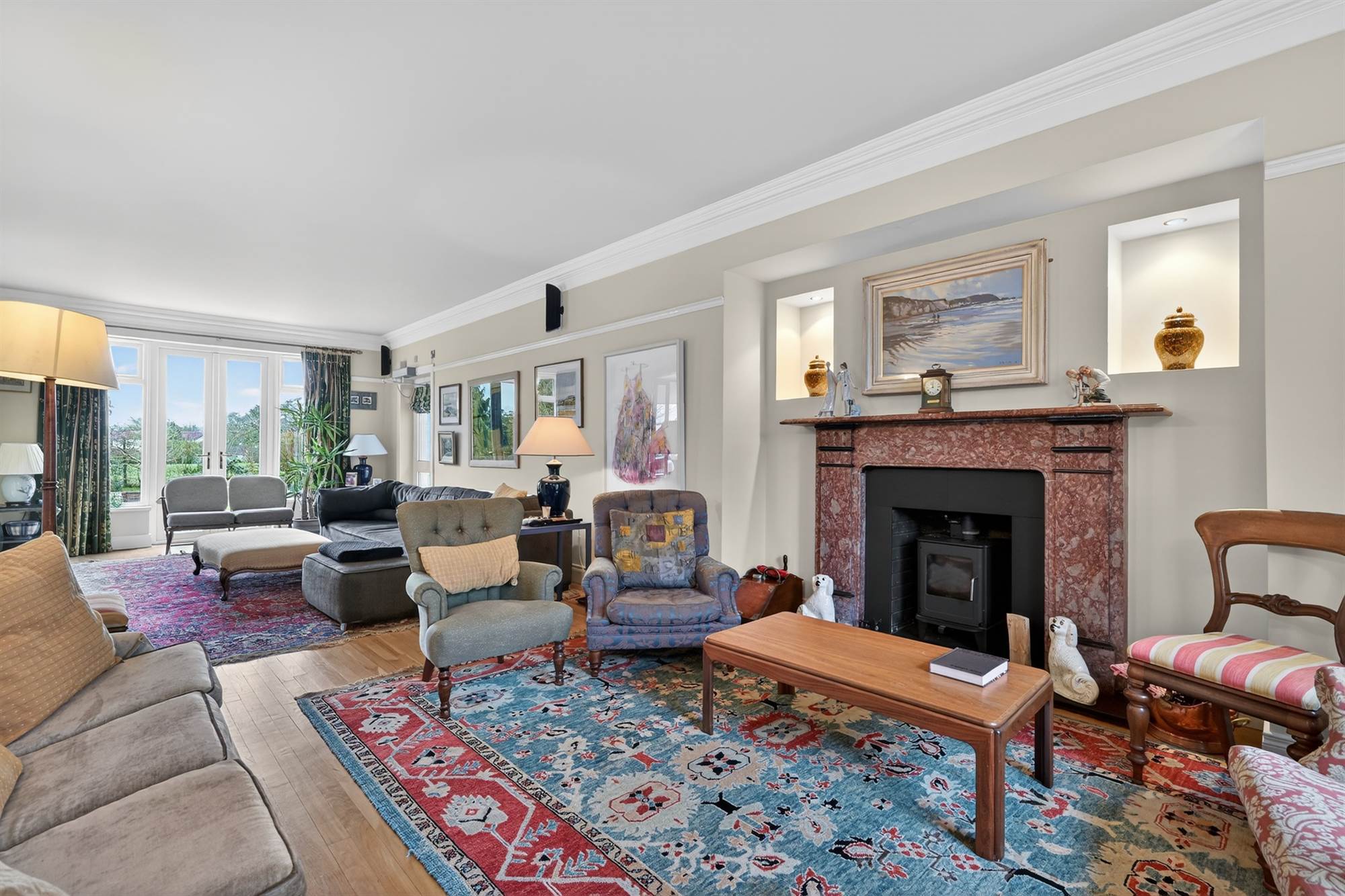 Drawing room with cast iron wood burning stove & French doors to rear garden