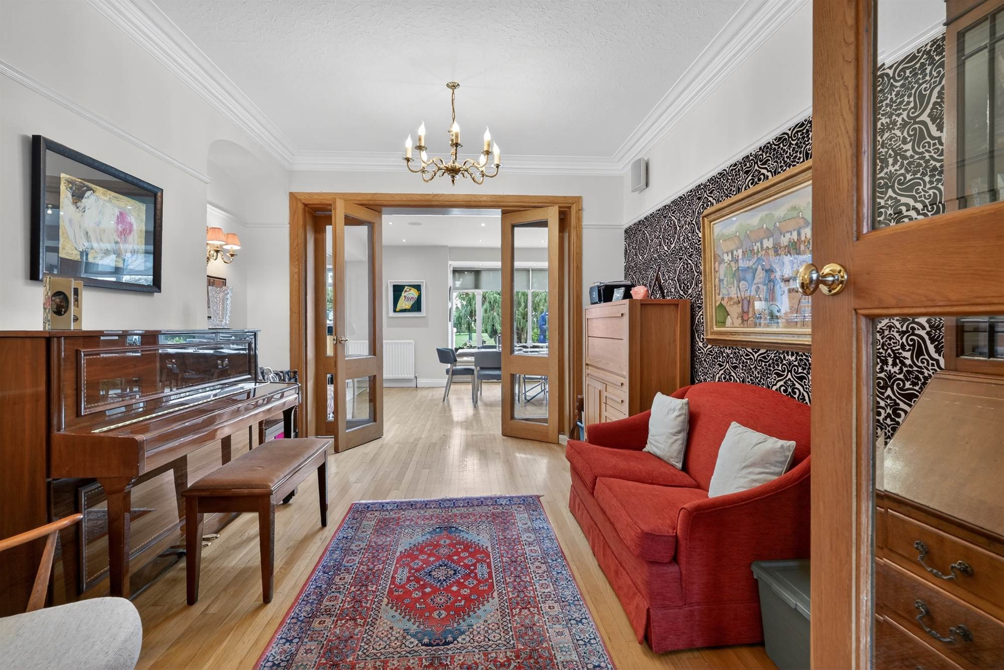 Solid oak wood strip floor, cornice ceiling, picture rail. Glazed double doors to . . .