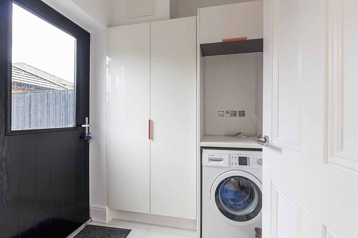 Matching gloss cupboards with copper handles. Plumbed for washing machine. Porcelain tiled floor. Door to rear.