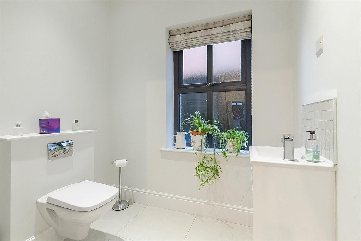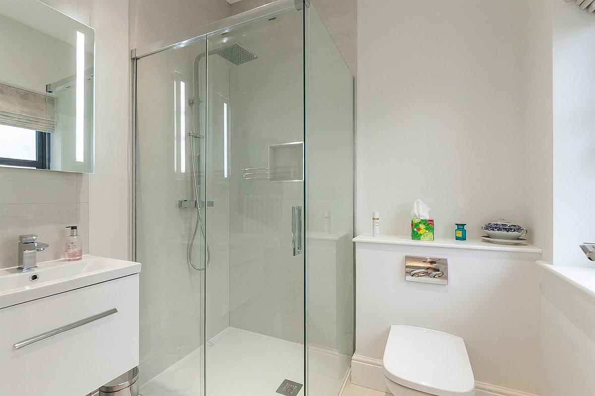 Fully tiled shower cubicle with drencher showerhead and secondary shower attachment. Low flush W.C Vanity unit with illuminated wall mirror above Heated towel rail. Part tiled walls. Ceramic tiled floor.