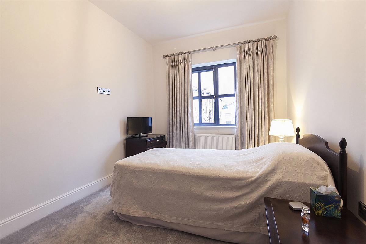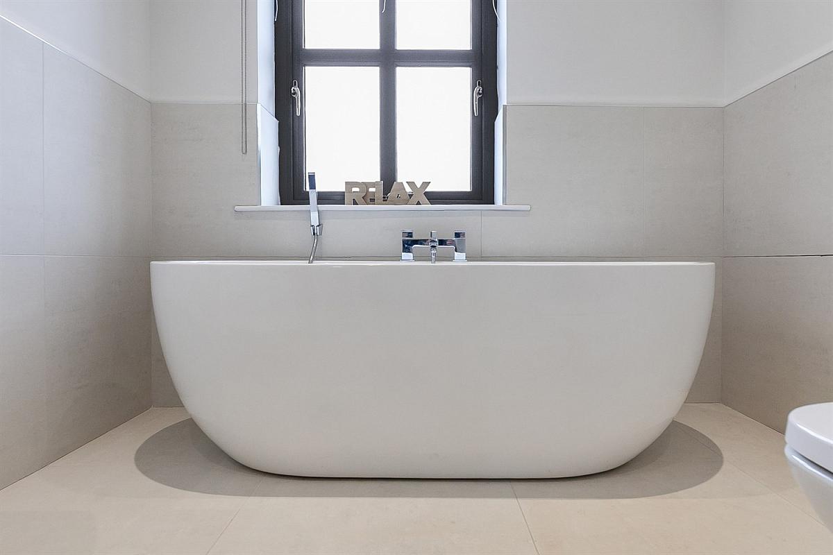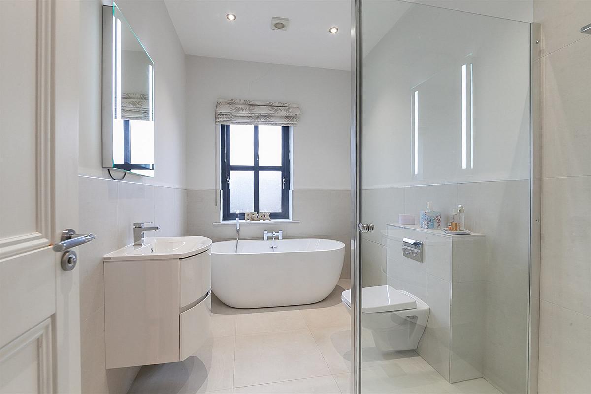 Freestanding bath with hand shower. Fully tiled shower cubicle with drencher showerhead and secondary shower attachment. Low flush W.C. Vanity unit with illuminated mirror above. Heated towel rail. Part tiled walls. Ceramic tiled floor.