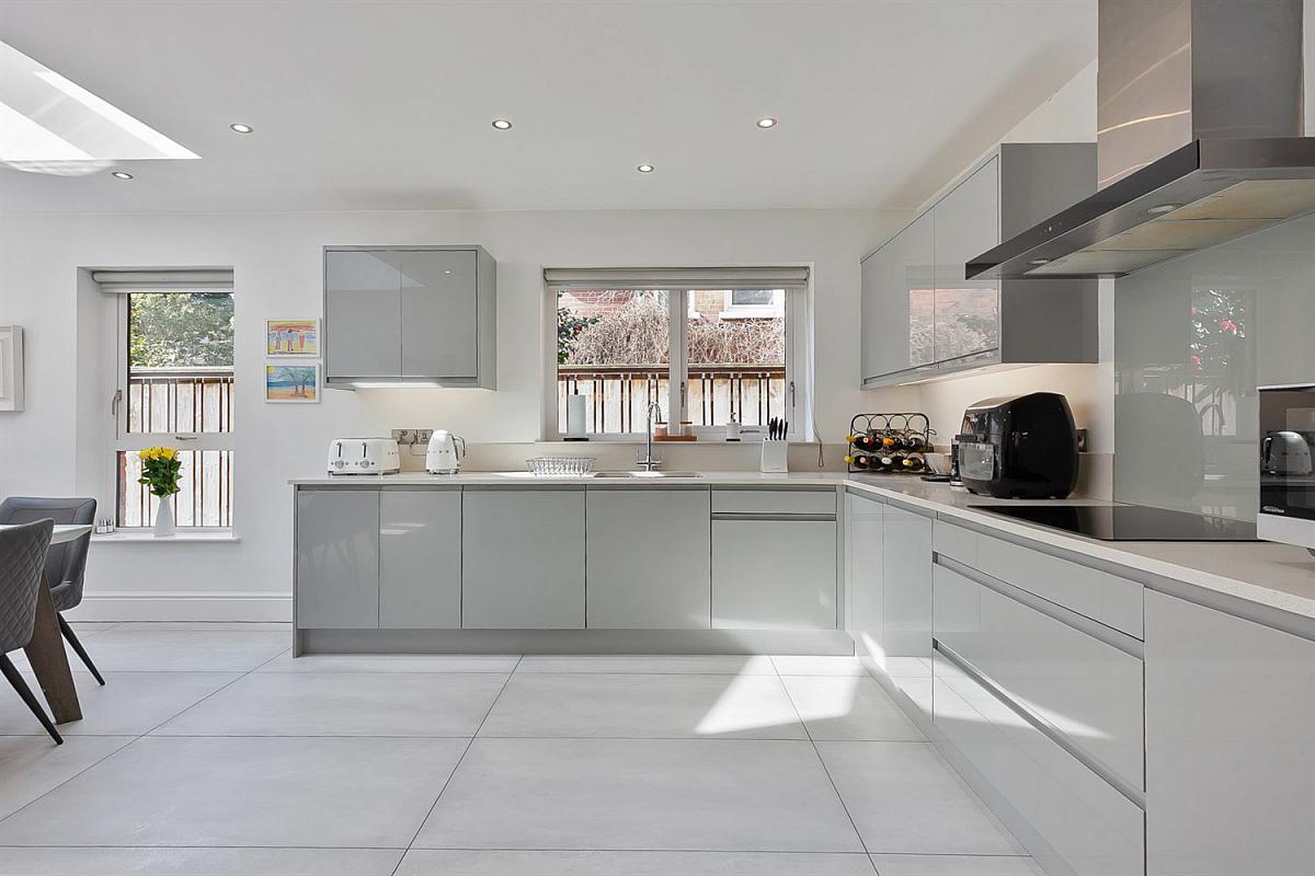 Full range of high and low level grey gloss units, 'Corrian' speckled worktop, 'Blanco' 1½ stainless steel sink unit, integrated 'Bosch' dishwasher, 'Bosch' 4 ring ceramic hob, stainless steel extractor hood, grey glass splashback, 'Bosch' stainless steel oven and combi, integrated fridge/freezer, tiled floor, vaulted roof lantern. Bi-folding doors to South facing rear garden.
