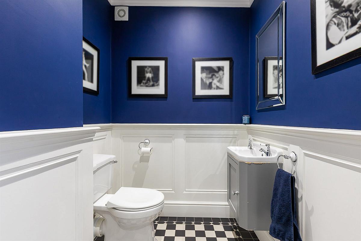 Low flush W.C, vanity unit, half panel walls, cornice ceiling, Victorian Black and White Chequer Tiled Floor.