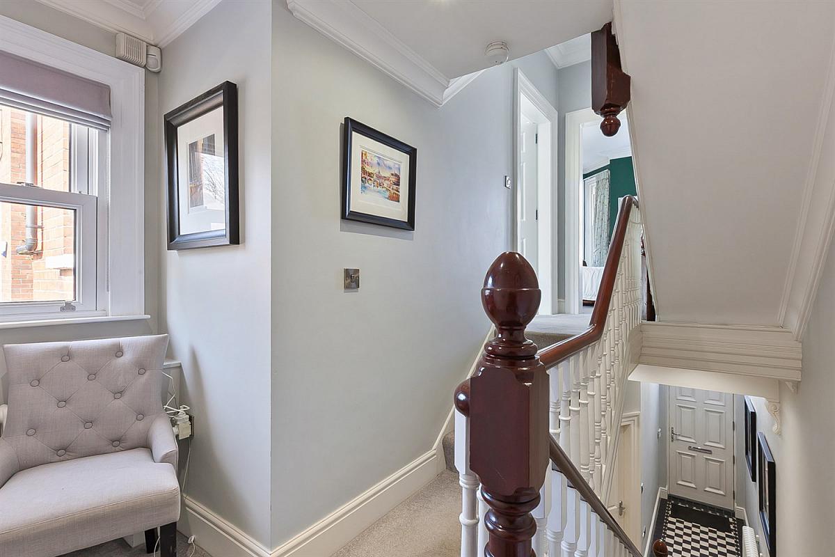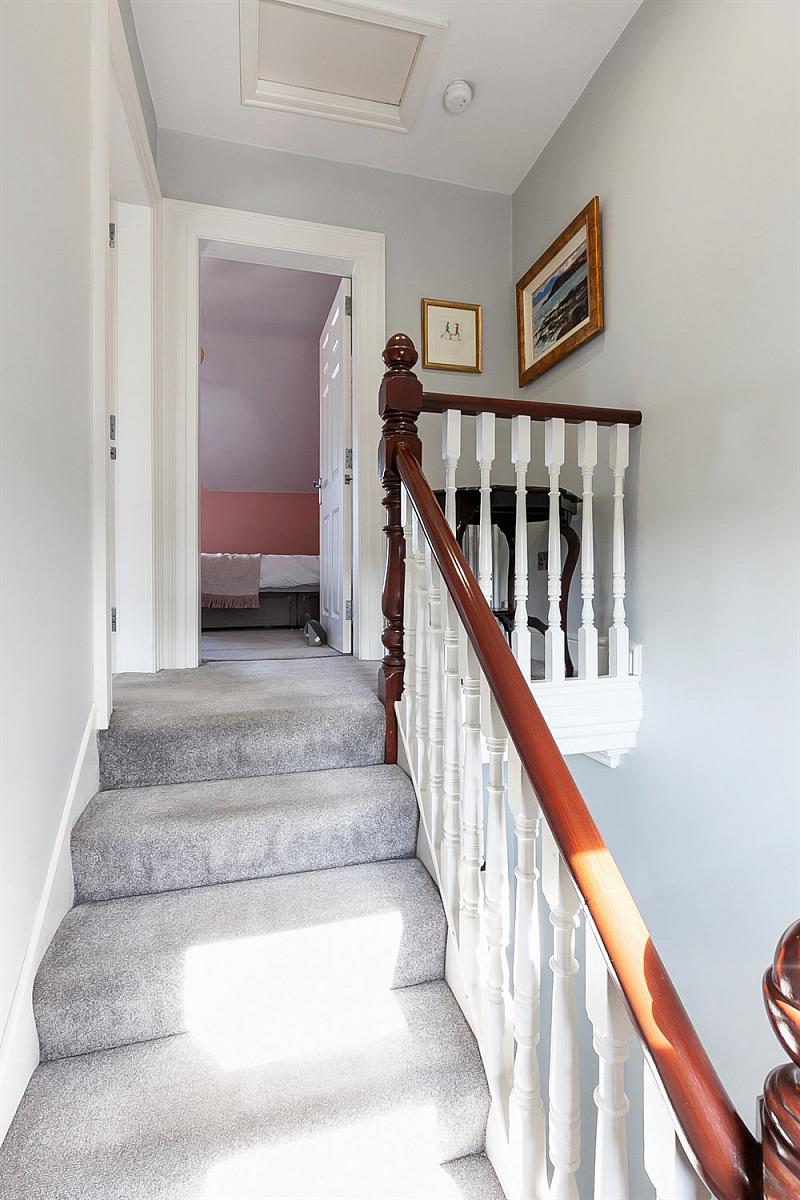Cornice ceiling. Access to fully floored roofspace. Double linen cupboard, shelved and gas fired boiler.