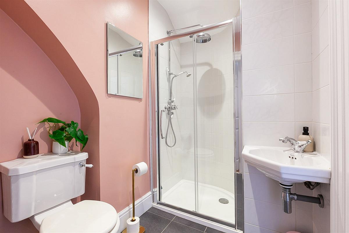 Fully tiled shower cubicle with drencher shower head and secondary shower attachment, low flush W.C, wash hand basin, chrome heated towel rail, part tiled walls, tiled floor.