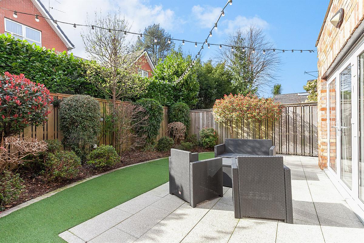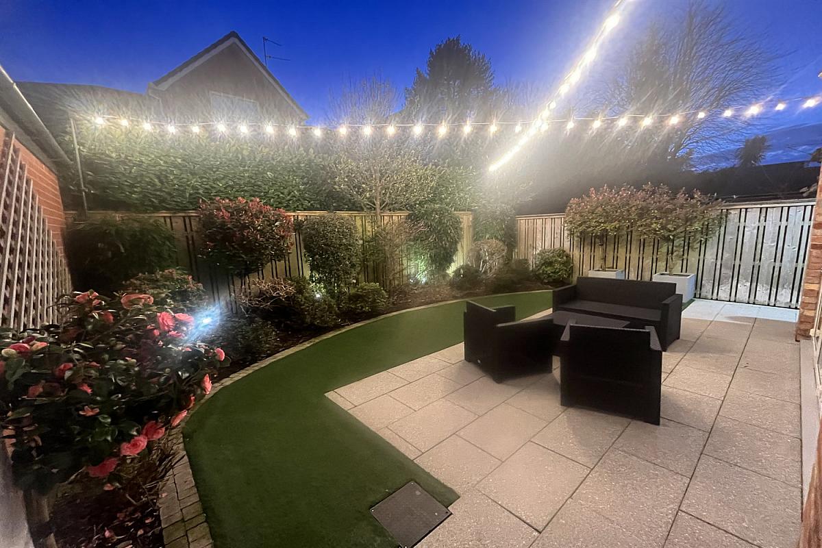 Private and enclosed South facing landscaped rear garden, stone patio area, artificial lawn, flower beds, trees and shrubs, boundary fencing, outside lighting.