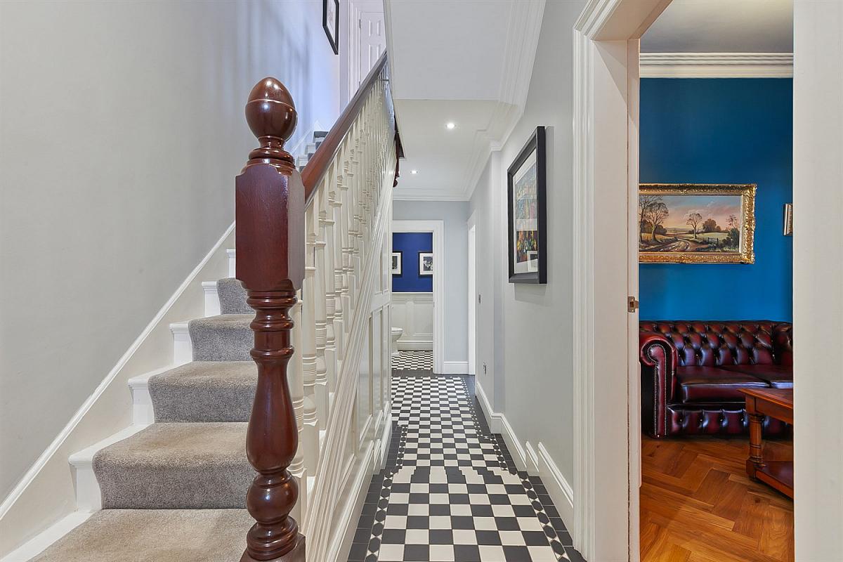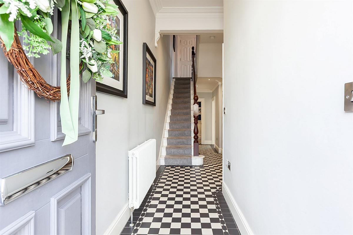 Cornice ceiling, Victorian Black and White Chequer Tiled Floor. Cloaks storage under stairs.