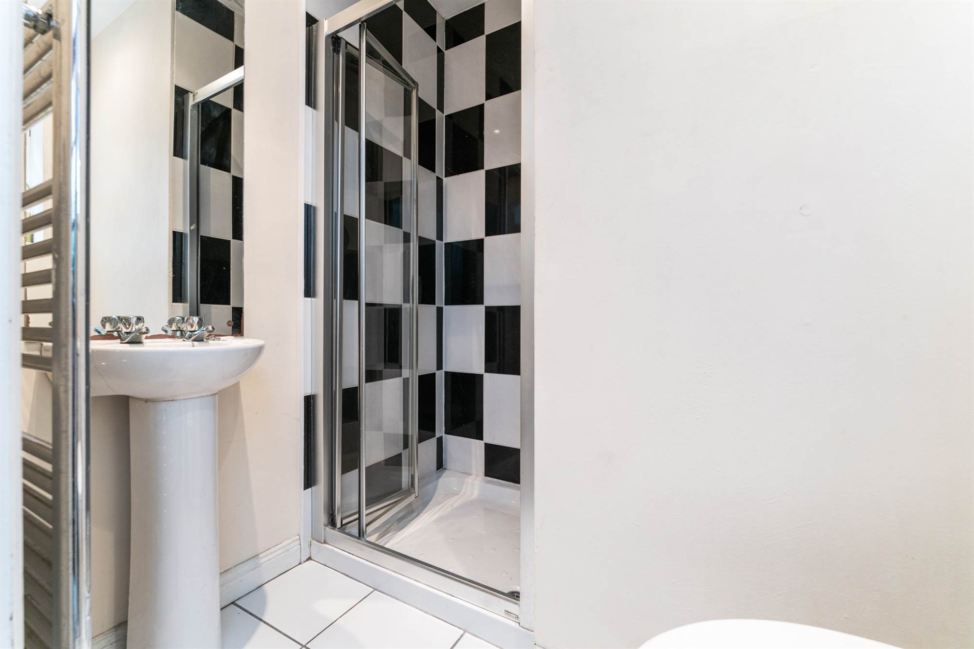 White suite comprising fully tiled shower cubicle, pedestal wash hand basin and low flush WC. Ceramic tiled floor and recessed low voltage spot lights.
