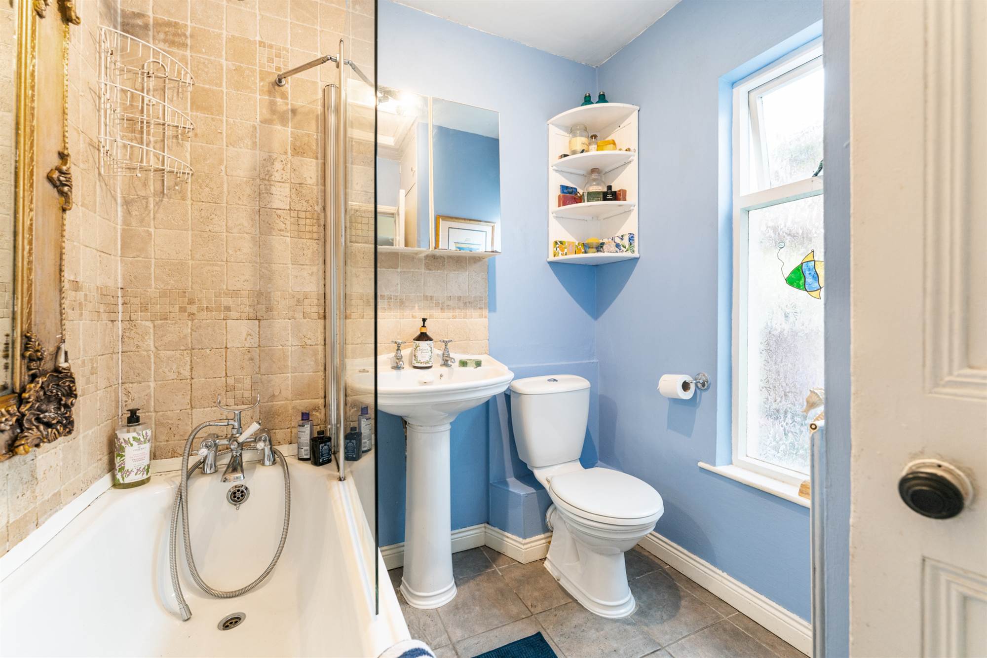 Contemporary white suite comprising panelled bath, with hand held shower and shower over, pedestal wash hand basin and low flush WC. Access to shelved hot press.