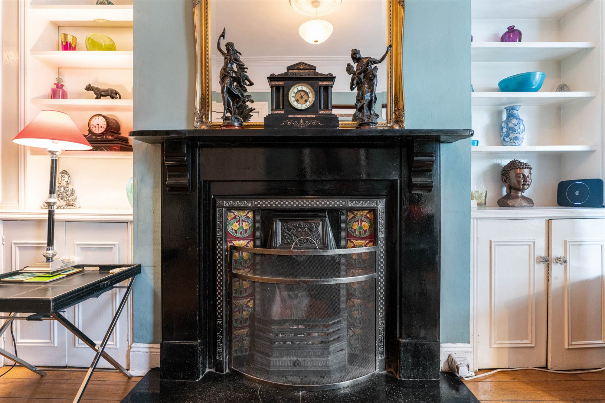 (max) Picture rail, exposed wood floor, marble fireplace with tiled inset, slate hearth and open fire.