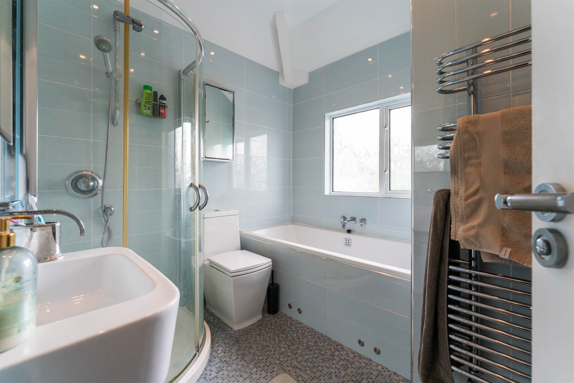 White suite, panelled bath, mixer taps, shower enclosure, low flush WC, wash hand basin