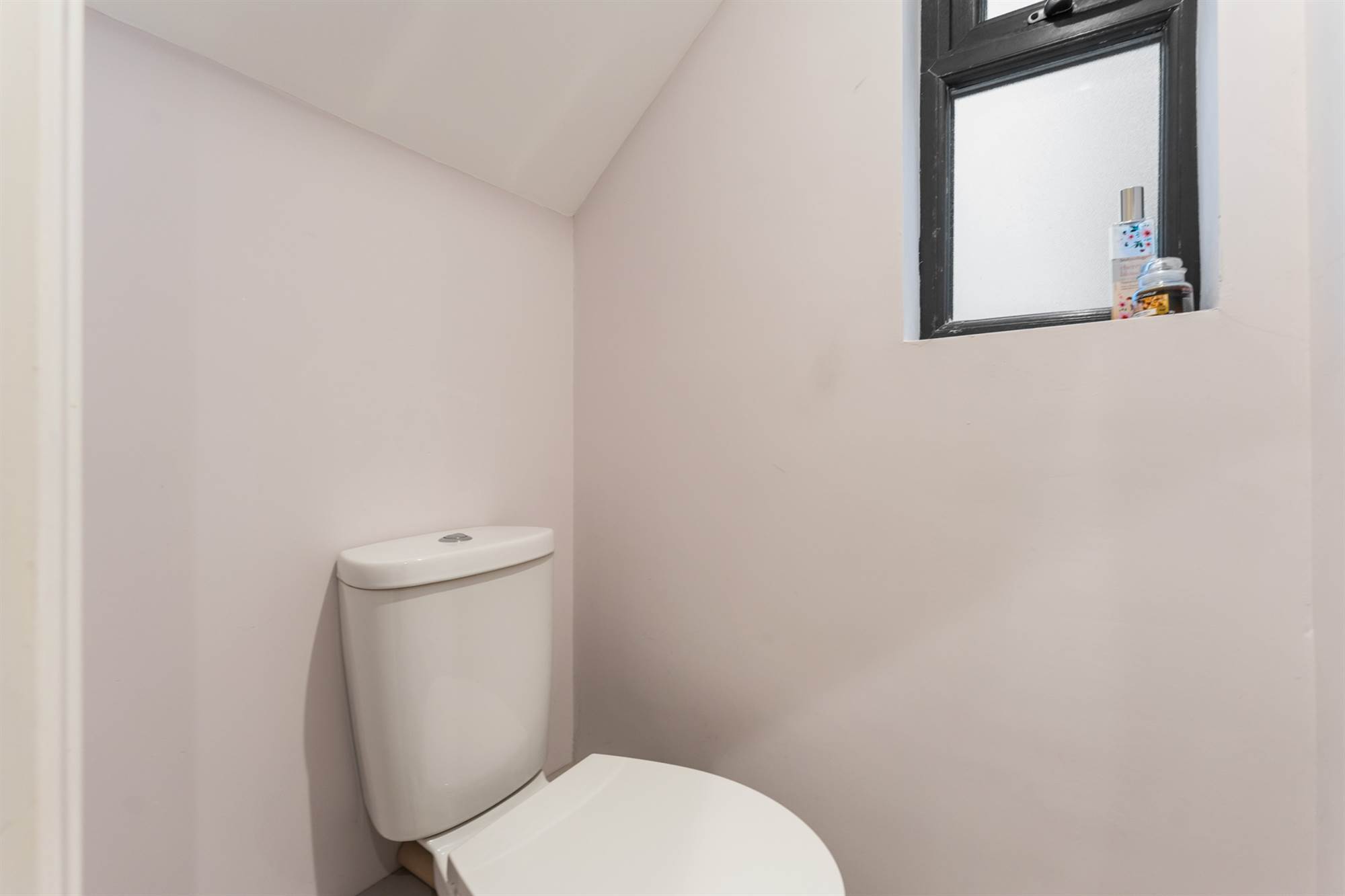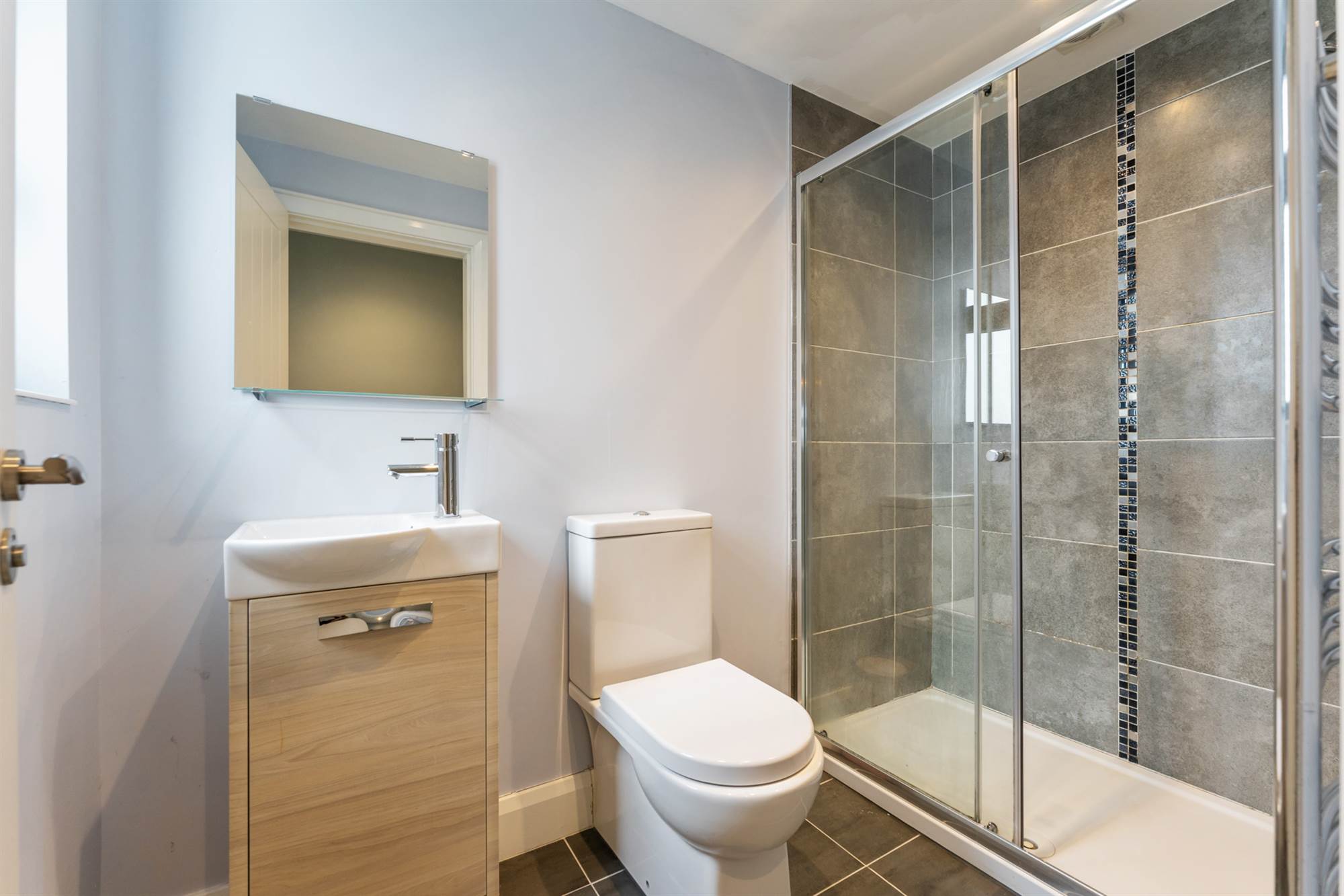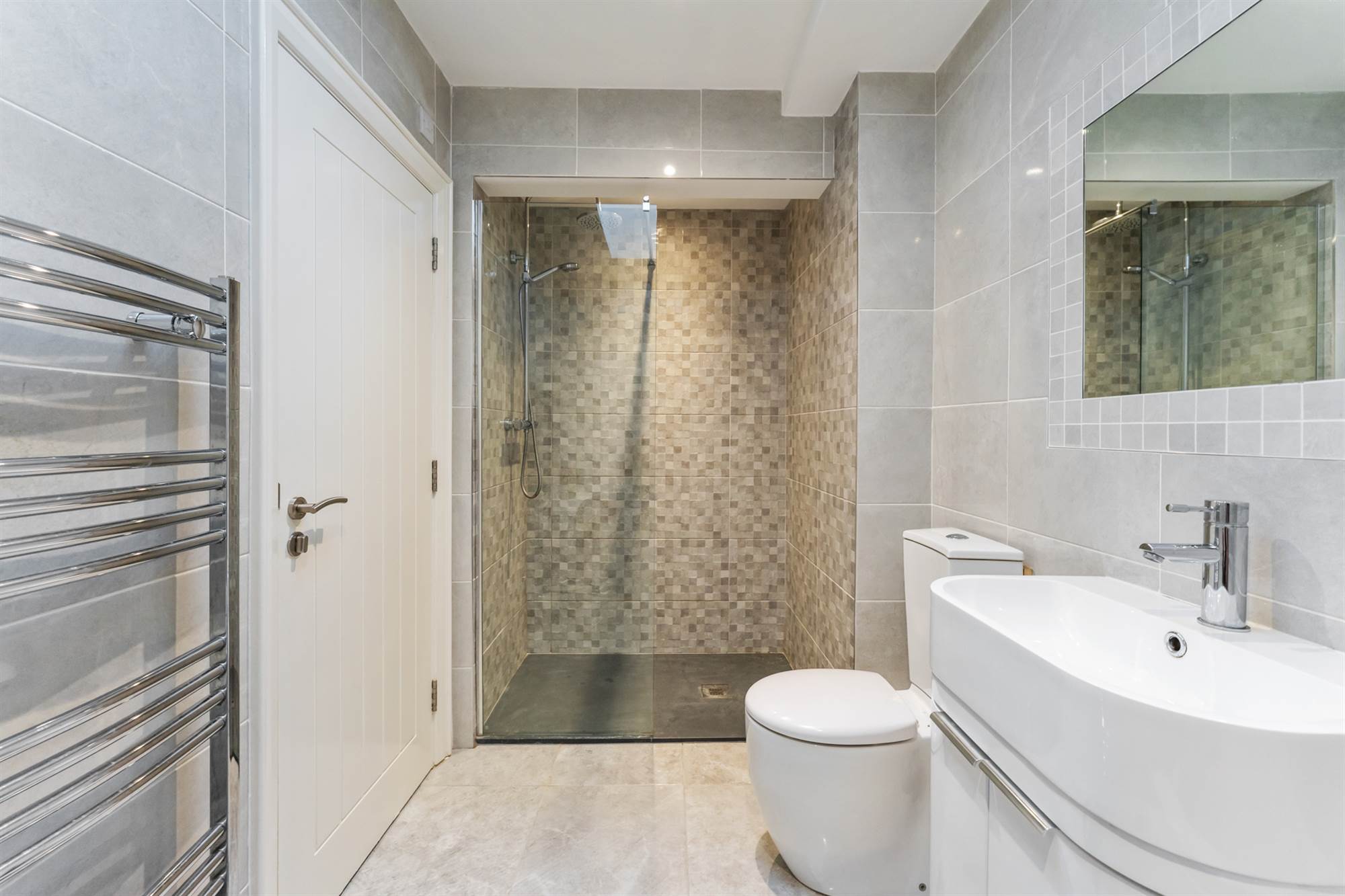Walk-in wet room style shower with shower head. Low flush WC. Vanity unit. Panelled bath. Heated towel rail. Velux window. Wall mirror.