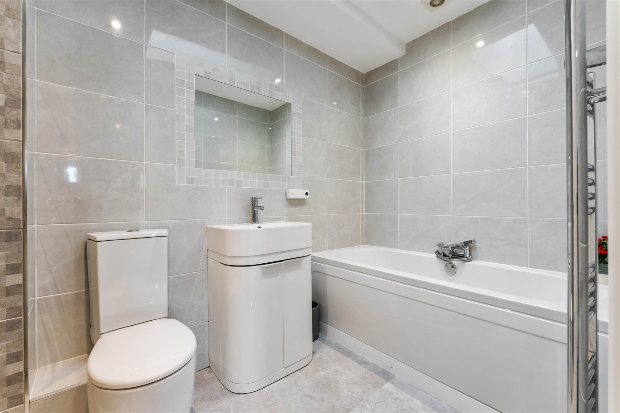 Fully tiled double shower cubicle. Low flush WC. Vanity unit. Heated towel rail. Tiled floor.
