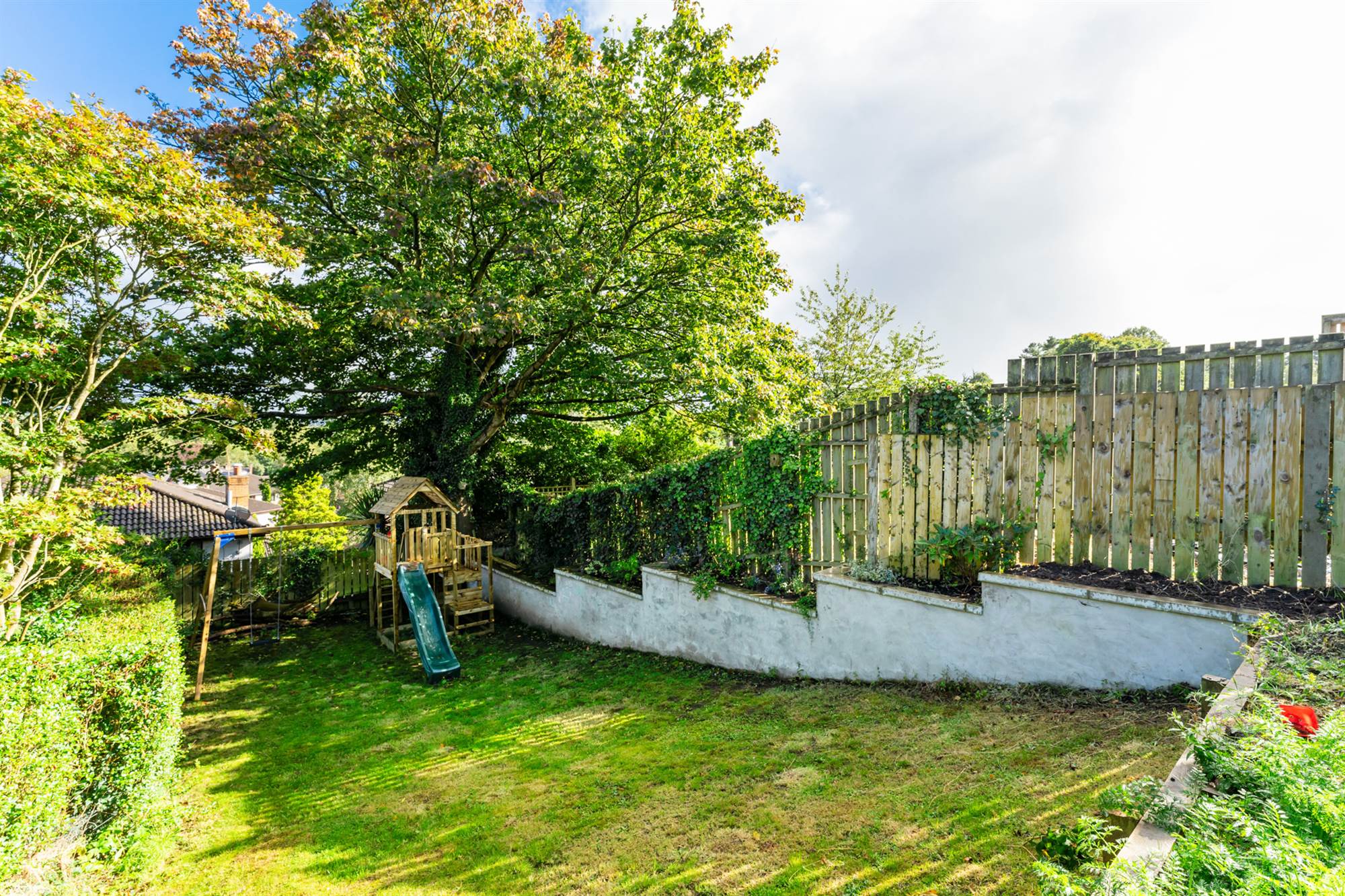 Tarmac driveway parking to front with boundary wall with black slate. Rear raised paved sun terrace. Lower concrete area with garden shed. Lower garden area in lawns, trees and shrubs, boundary fence, wall and hedging.