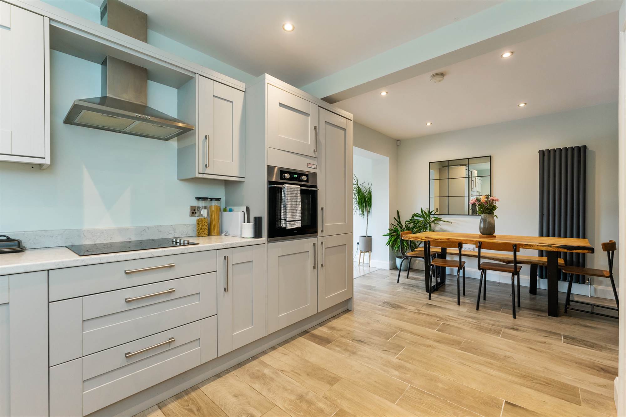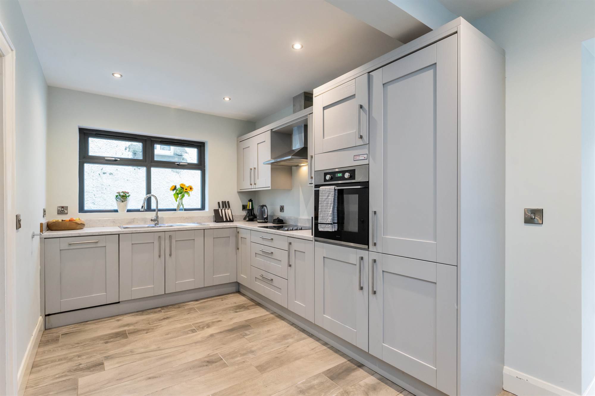 Range of high and low level units. 1.5 bowl single drainer stainless steel sink unit. Integrated fridge and freezer. Caple electric oven. Caple 4 ring hob and stainless steel extractor hood. Integrated Caple dishwasher. Platinum cloud worktop. Tiled floor. Larder cupboard.