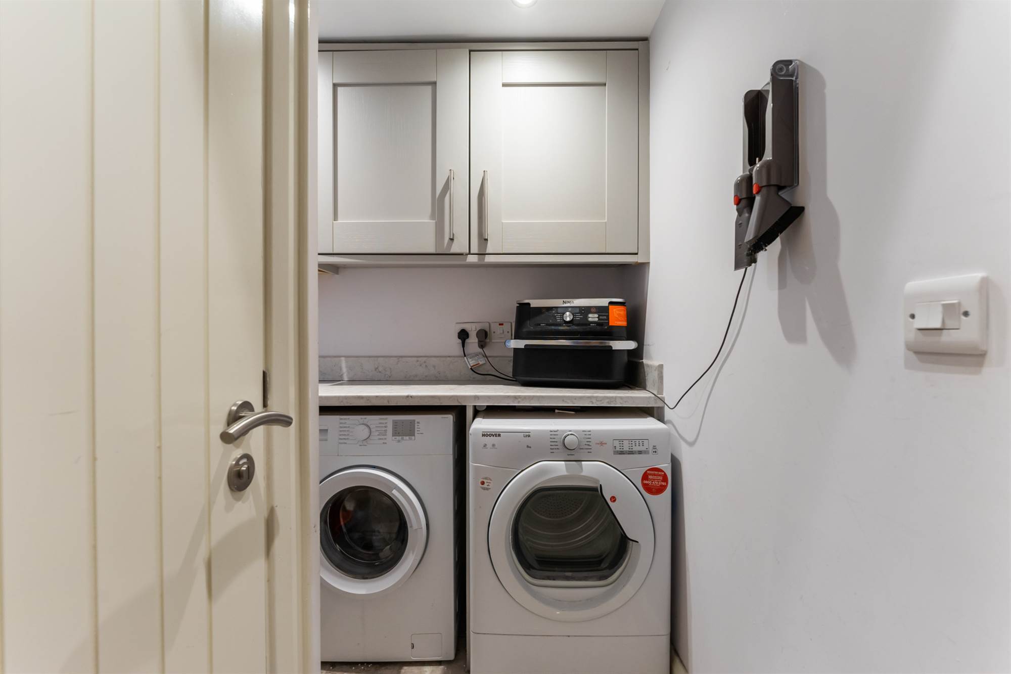 Fitted units. Single drainer stainless steel sink unit. Plumbed for washing machine and tumble dryer. Low flush WC. Tiled floor.