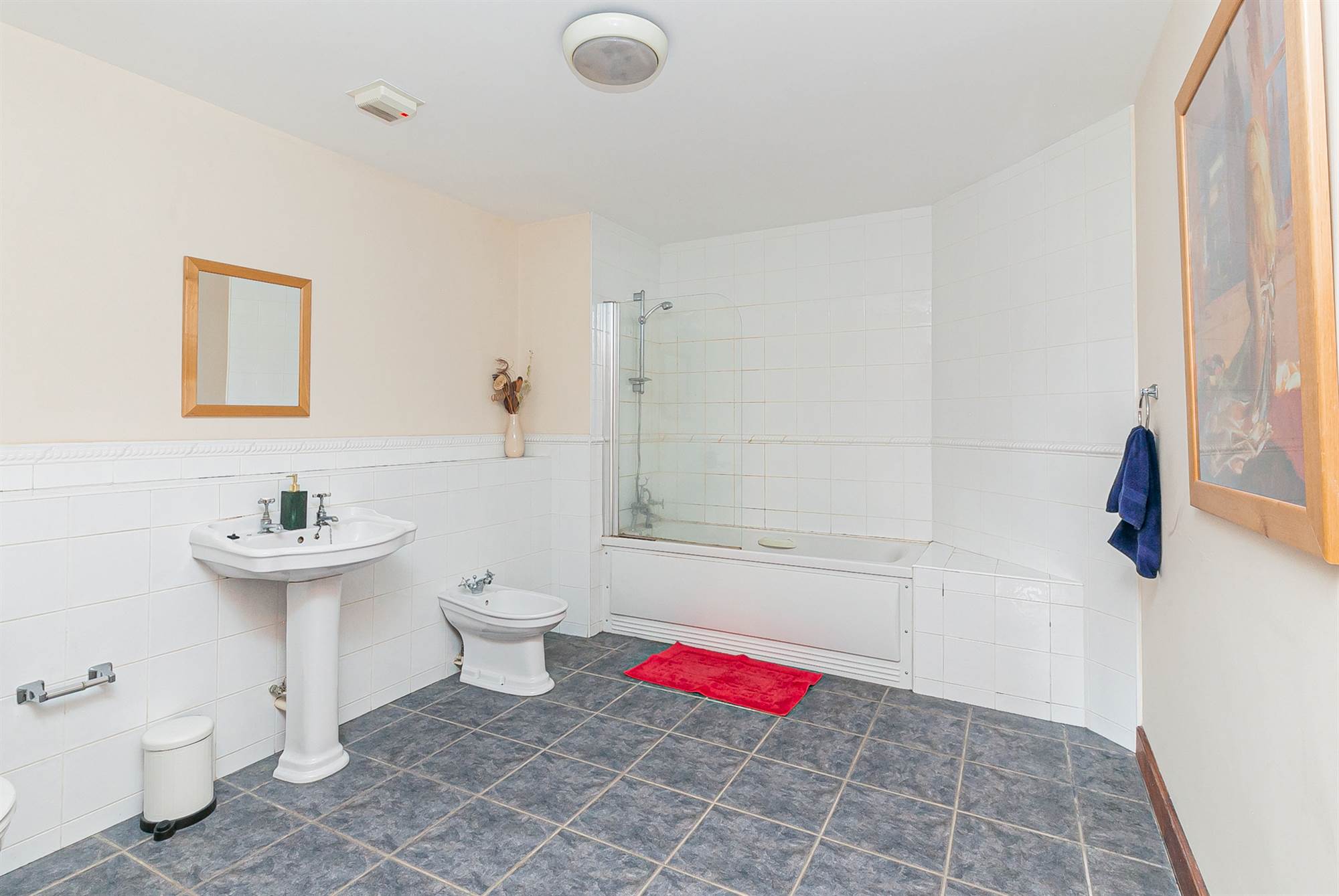 Low flush WC, pedestal wash hand basin, bath with shower above, shower cubicle, ceramic tiled floor, half tiled walls